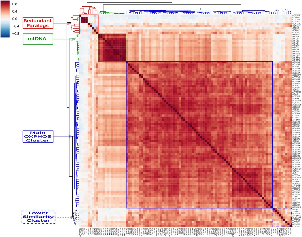 OXPHOS gene expression patterns across all tissues support the general coregulation of mito-nuclear gene expression. A heat map of correlation values for the expression of all OXPHOS genes. The four clusters (redundant paralogs, mtDNA, main OXPHOS cluster, and lower similarity cluster) are framed in squares (red, green, full blue, and dashed blue line, respectively). A key for the color code of the Spearman's correlation coefficients is shown in top left corner.