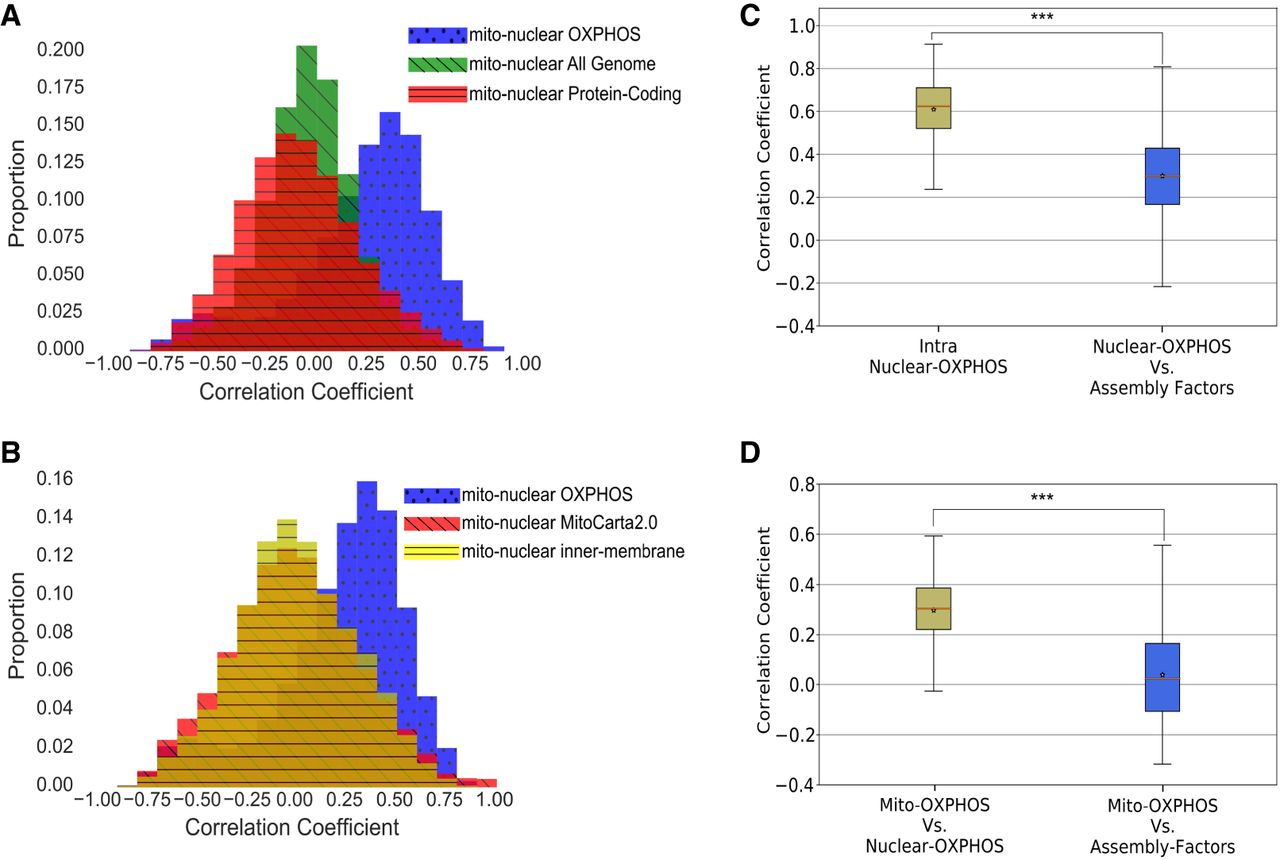 The overall positive co-expression of mitochondrial and nuclear genes is limited to OXPHOS structural subunits, excluding assembly factors. (A) A histogram panel demonstrating expression correlation distributions between mtDNA-encoded OXPHOS genes and either genome-wide non-OXPHOS genes (green), non-OXPHOS protein coding genes (red), or nDNA-encoded OXPHOS genes (blue). (B) A histogram panel demonstrating expression correlation distributions between mtDNA-encoded OXPHOS gene and either nDNA-encoded non-OXPHOS mitochondrial proteins listed in MitoCarta2.0 (Calvo et al. 2016) (red), a MitoCarta subset of mitochondrial inner-membrane proteins (yellow), and nDNA-encoded OXPHOS genes as a reference (blue). (C) Box plots representing the correlations (Spearman's correlation coefficients) between nDNA-encoded OXPHOS genes (intra-OXPHOS) versus their correlations with OXPHOS complexes assembly factors genes. Star: average value. (D) Box plots representing the correlations (Spearman's correlation coefficients) of mtDNA OXPHOS genes with nDNA OXPHOS genes versus their correlations with OXPHOS assembly factors. Red lines: median correlation coefficient; stars: average correlation coefficient. (***) P < 1 × 10−100.