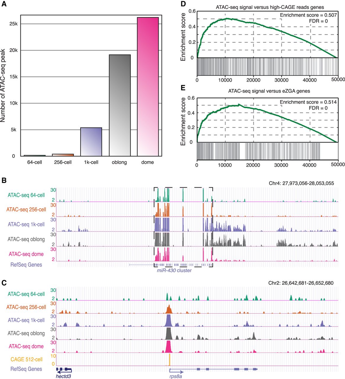 Establishment of accessible chromatin during the minor phase of ZGA. (A) The bar plot illustrates the number of accessible chromatin regions at each stage during ZGA. (B) The genome browser view shows the ATAC-seq signals around the miR-430 cluster regions, which are indicated by the dashed box. (C) The genome browser view highlights the ATAC-seq signals at the rps8a locus as a representative example of accessible chromatin that appeared at the 256-cell stage. (D) Gene Set Enrichment Analysis (GSEA) for the association between promoter accessibility and transcription activity. All genes were ranked according to the levels of chromatin accessibility at the promoters at the 256-cell stage. Genes with more than 500 CAGE reads around their TSSs at the 512-cell stage (TSS ± 50 bp; 811 genes) were treated as a gene set. Enrichment score and FDR were calculated by GSEA. (E) GSEA for the association between promoter accessibility and transcription activity. All genes were ranked according to the levels of chromatin accessibility at the promoters at the 256-cell stage. The reported early ZGA genes (993 genes) were treated as a gene set. Enrichment score and FDR were calculated by GSEA.