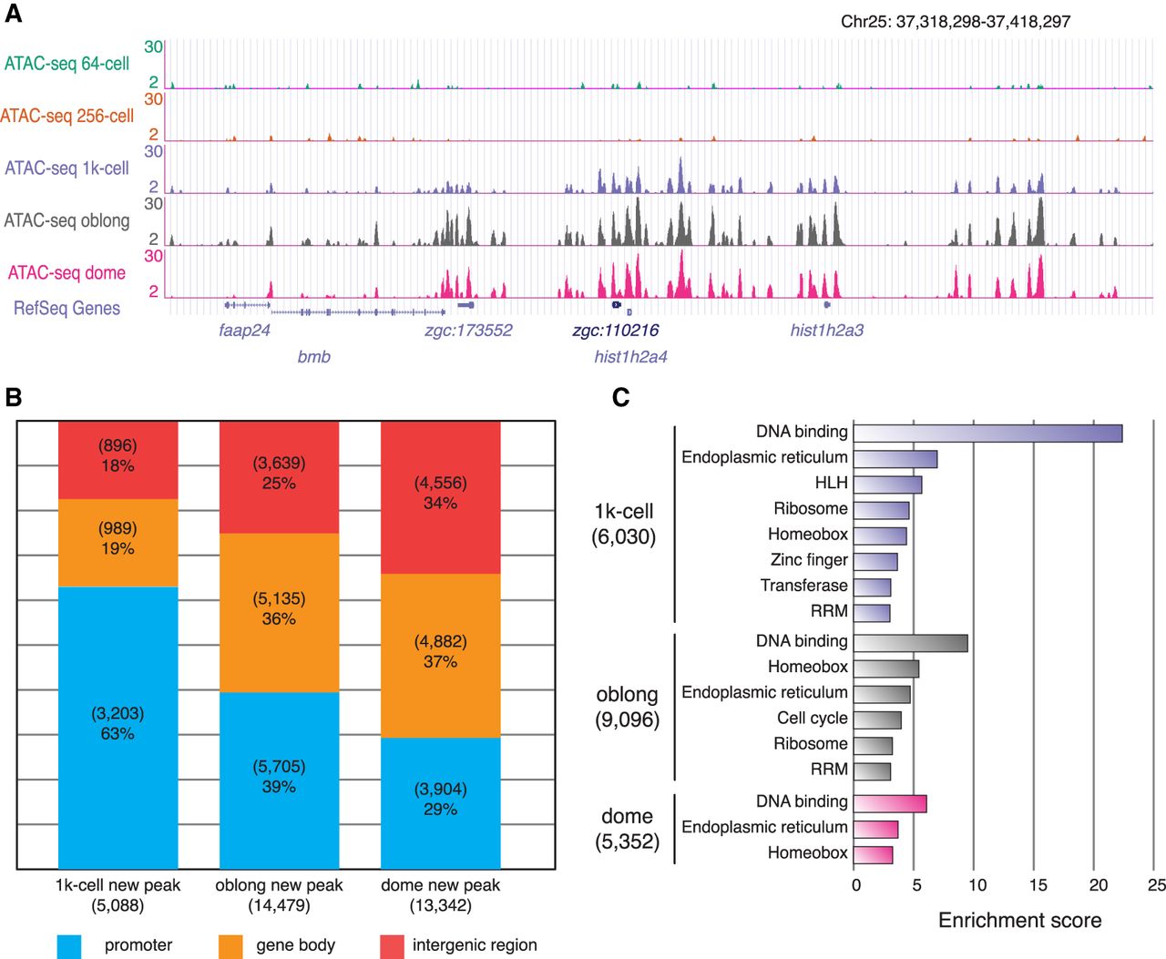 Establishment of accessible chromatin during the major phase of ZGA. (A) The genome browser view shows the ATAC-seq signals at the representative region as an example of accessible chromatin that appeared during the major phase of ZGA. (B) The bar plot shows the percentages of newly established ATAC-seq peaks that are in the promoter (TSS ± 2 kb), gene body, and intergenic region during the major phase of ZGA. (C) GO enrichment analysis of genes with newly accessible promoters at the major phase of ZGA. Enrichment scores were calculated by DAVID (Huang da et al. 2009a,b).
