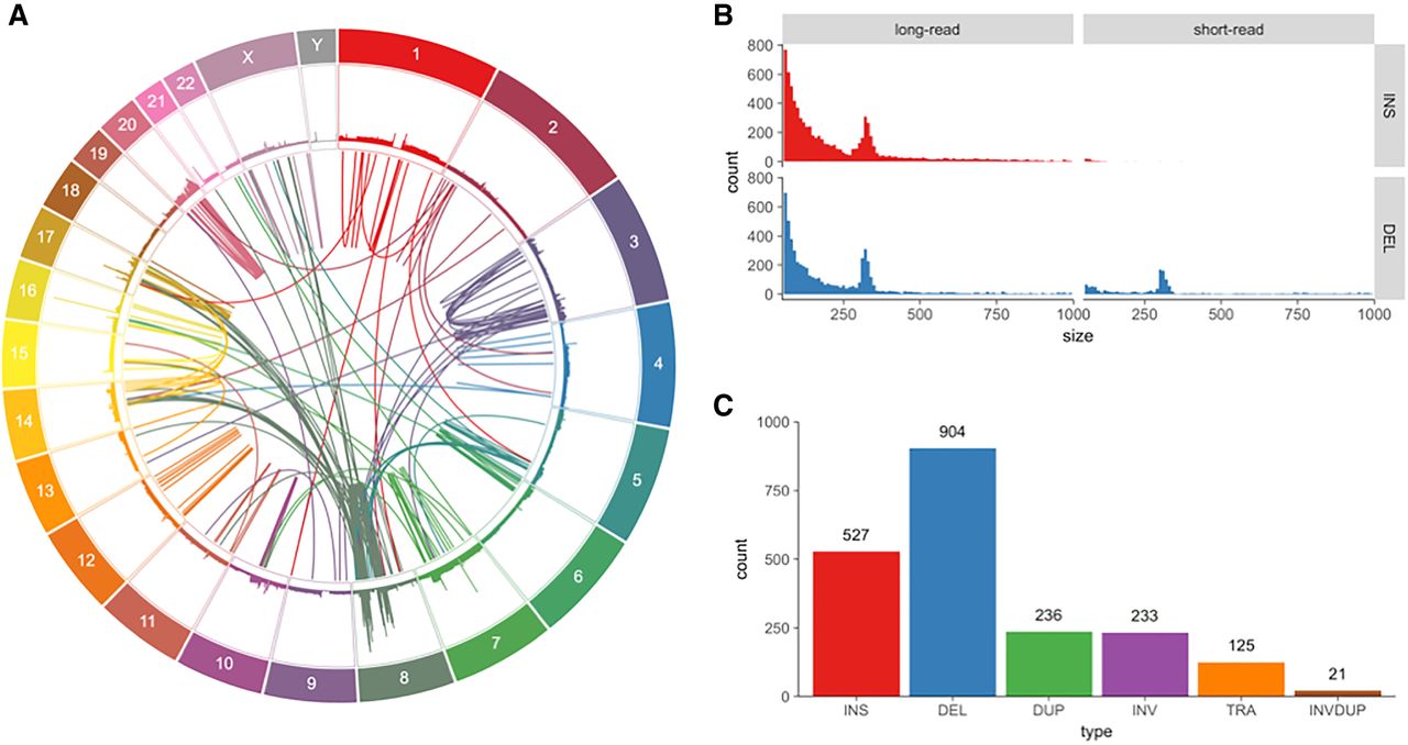 Variants found in SK-BR-3 with PacBio long-read sequencing. (A) Circos (Krzywinski et al. 2009) plot showing long-range (larger than 10 kbp or inter-chromosomal) variants found by Sniffles from split-read alignments, with read coverage shown in the outer track. (B) Variant size histogram of deletions and insertions from size 50 bp up to 1 kbp found by long-read (Sniffles) and short-read (SURVIVOR 2-caller consensus) variant calling, showing similar size distributions for insertions and deletions from long reads but not for short reads, where insertions are greatly underrepresented. (C) Sniffles variant counts by type for variants above 1 kbp in size, including translocations and inverted duplications.