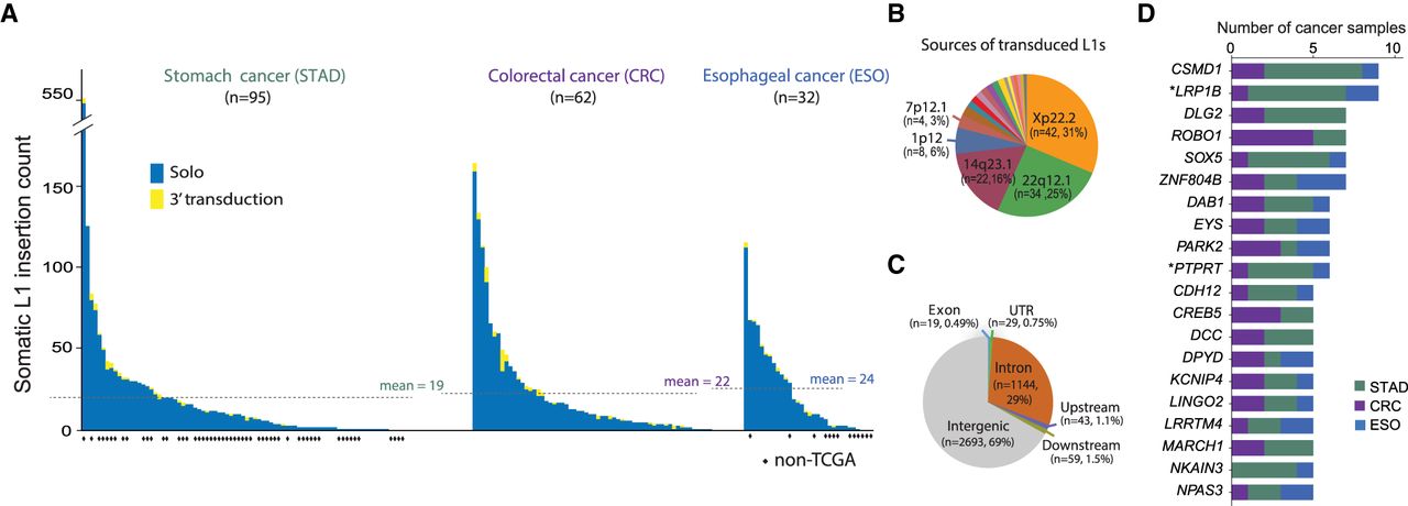 Landscape of somatic L1 insertions in gastrointestinal cancers. (A) Frequency of somatic L1 insertions across three cancer types. The dotted line denotes the average insertion count for each cancer type. (B) Source L1 elements of somatic L1 insertions with 3′ transduction. (C) Genomic distribution of somatic L1 insertions. Upstream/downstream insertions are those that occur within 5 kb from the transcription start/end sites of genes. (D) Genes with recurrent somatic L1 insertions. Genes with insertions in more than four cancer patients are shown. (*) Known cancer genes reported in the COSMIC Cancer Gene Census database v82 (Forbes et al. 2017).