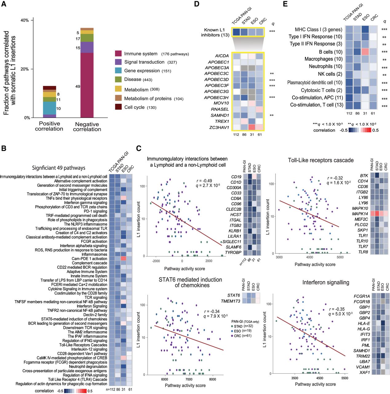 Immune activity associated with somatic L1 retrotransposition. (A) Reactome pathways for which activity correlates with somatic L1 insertion frequency. For each pathway category, the percentage of pathways showing a significant positive or negative correlation between pathway activity and somatic L1 insertion frequency (FDR < 0.05) is shown in a stacked bar. The number of significantly correlated pathways for each category is shown beside the stacked bar. The number of all member pathways for each category is shown in parentheses, and only the categories with more than 100 member pathways are shown. (B) Forty-nine immune pathways whose activity shows a significant negative correlation with L1 insertion frequency (FDR < 0.05). Each cell in the heatmap shows a color-scaled Spearman correlation coefficient between the activity of each immune pathway (row) and the frequency of somatic L1 insertions in cancer samples from each cancer type (column). (C) Examples of the significant immune pathways. The pathway activity score (x-axis) and L1 insertion count (y-axis) is marked with a colored dot for each cancer sample. Green, blue, and purple dots represent STAD, ESO, and CRC samples, respectively. The Spearman correlation coefficient and its P-value are shown. Key member genes whose expression levels were significantly correlated with insertion counts (FDR < 0.05) are shown in the heatmap. Each cell in the heatmap shows a color-scaled Spearman correlation coefficient between gene expression level and L1 insertion frequency. Up to 15 key genes are shown, ranked by the significance of the correlation. Key genes that are present in multiple pathways are shown once. (D) Correlation between the expression level of 13 known L1 inhibitors and the frequency of somatic L1 insertions. The top row of the heatmap shows the Spearman correlation coefficient between the activity of a gene set with 13 known inhibitors and L1 insertion frequency for each cancer type (column). The bottom rows of the heatmap show the coefficients for individual inhibitors (row). A row with a PAN-GI correlation of q < 0.01 and q < 0.001 (adjusted P-values combined across all cancer types using the Fisher's method) is marked with double and triple asterisks, respectively. (E) Various immune gene sets showing a negative correlation with L1 insertion frequency.