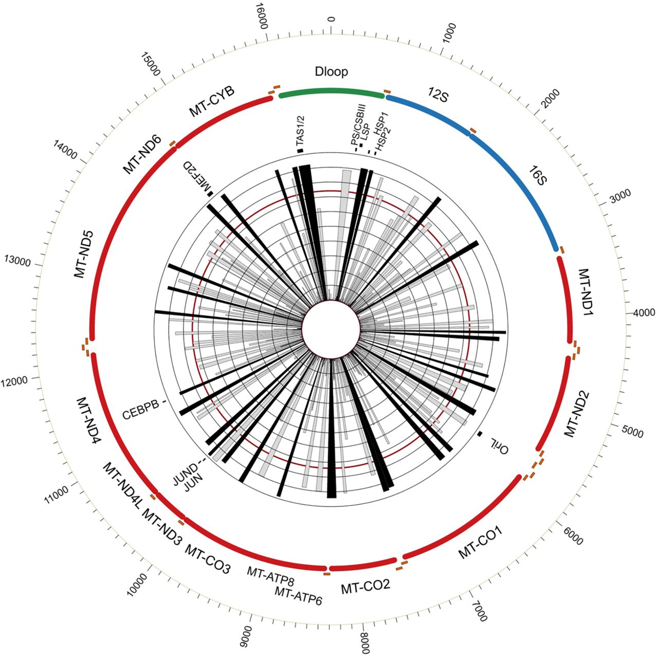 Graphical overview of human mt-DGF sites. mtDNA location of all identified human mt-DGF sites (n = 246) according to their prevalence in the ENCODE sample collection. The inner ray histograms represent the prevalence of each site across ENCODE samples, with each concentric circle marking 10th percentile increments of the data set (from 0% to 100%). The red circle marks 74% of the samples, which refers to the average +1 SD of the samples tested. Black rays indicate the most prevalent mt-DGF sites. The mtDNA position of known regulatory elements and protein binding sites are indicated (JUN = cJUN).