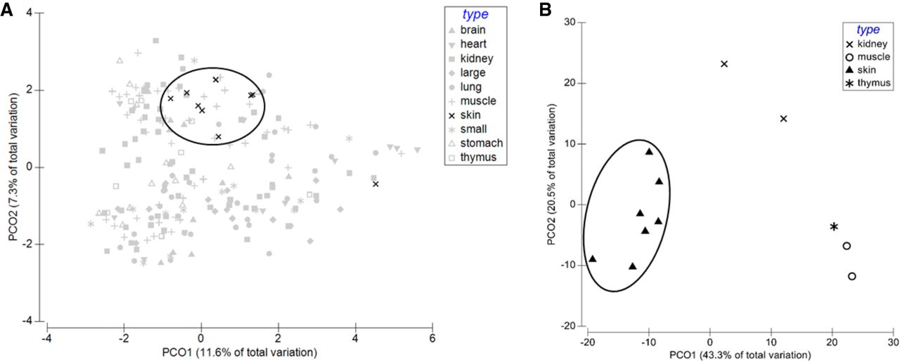Evidence for tissue specificity in the mt-DGF pattern. PCO analysis of the Roadmap collection. (A) All Roadmap samples (“large” and “small” refer to large intestine and small intestine, respectively). (B) All samples from fetal day 97 (total = 12; skin = 7). Encircled are the human skin samples.
