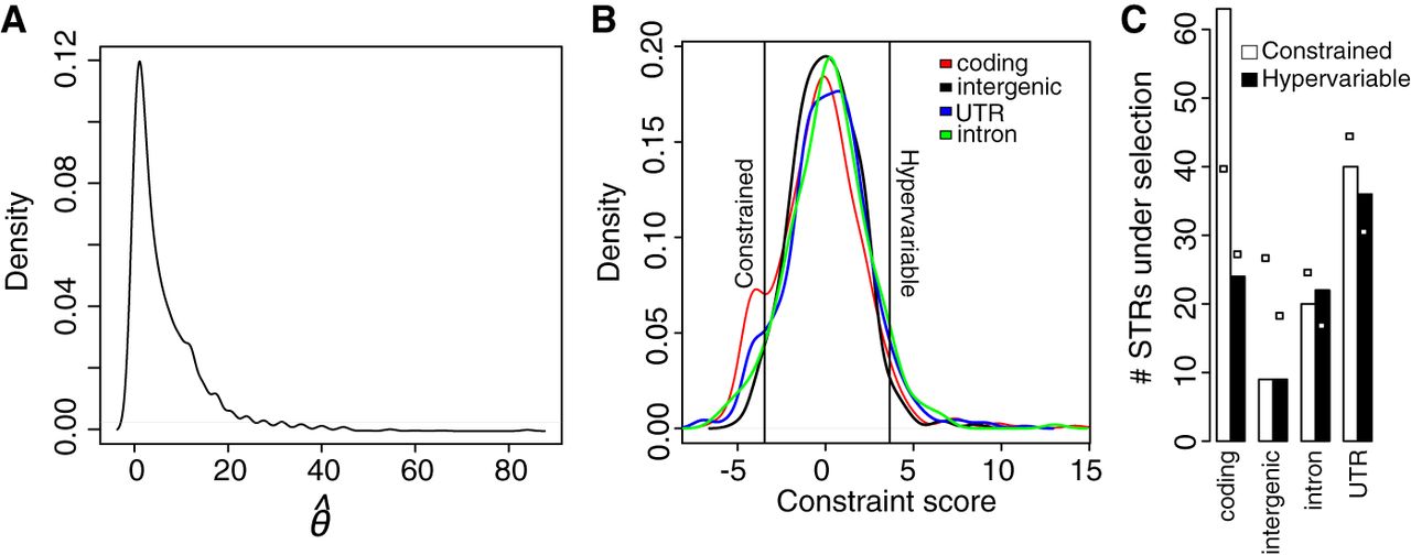 respectively. (C) STRs under selection, e.g., constrained or hypervariable STRs, separated by locus category. White boxes indicate the expected