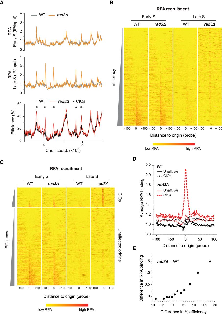 Abnormal accumulation of ssDNA at de-regulated origins. (A) Profiles of RPA binding and origin usage in a representative region of the genome. Full RPA and origin profiles are in Supplemental Figure S2B. Top and middle: RPA recruitment in early (60 min, top) and late (80 min, middle) S phase in wild type (WT, gray) and rad3Δ (orange). y-axis: RPA binding (IP/input). Bottom: origin efficiencies for WT (black) and rad3Δ (red). Asterisks mark CIOs. y-axis: origin efficiency. x-axis for all panels: chromosome coordinates. (B) Heat maps of RPA recruitment at origins in HU-treated wild-type and rad3Δ cells in early and late S phase. Data are from ChIP-chip experiments in A and Supplemental Figure S2B. All origins are shown in order of increasing efficiency; the most efficient origins are at the bottom of the plot. Position 0: central probe for each origin; values in a window of 100 probes on either side of each origin are displayed. A more intense red represents a higher level of RPA binding. (C) Heat maps of RPA recruitment, with origins divided into two categories: unaffected origins and CIOs (data are the same as in B). Origins in each category are displayed according to their efficiencies. Probe positions and color codes are as in B. (D) Average signal plots of RPA binding at origins in HU. Each line represents average RPA binding at either unaffected origins (solid lines) or CIOs (dotted lines) in wild-type (black) and rad3Δ (red) cells. Position 0: central probe for each origin; values at each probe position in a 100-probe window on either side of each origin were averaged for all origins in a category. (E) Correlation between the differences in RPA binding and in origin usage between rad3Δ and wild type. Origins were divided into 12 equal subsets (73 origins/group) based on the changes in their efficiencies (rad3Δ – WT). The average differences in efficiency (x-axis) and RPA occupancy (y-axis) for each group are shown. The nonaveraged data are shown in Supplemental Figure S2E.