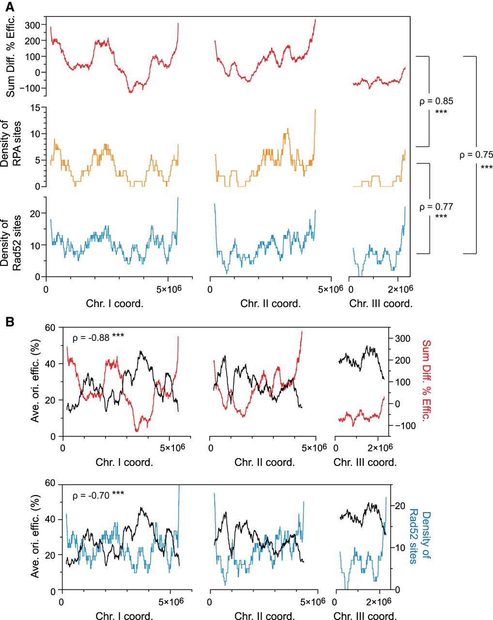 The profile of origin de-regulation delineates the profiles of RPA and Rad52 binding in replication stress. (A) Genome-wide comparisons of origin de-regulation and genome instability. This analysis takes into account all 876 identified origins as well as all RPA and Rad52 binding sites. The sum of the changes in origin efficiencies upon HU treatment (rad3Δ − WT, red) was determined in continuous 1000-probe windows. The densities of RPA (orange) and Rad52 (blue) sites were calculated for HU-treated rad3Δ cells over the same windows. x-axis: chromosome coordinates; y-axes: sum of the differences in origin efficiencies (top), density of RPA sites (middle), density of Rad52 sites (bottom). The Spearman's correlation coefficients (ρ) for the different comparisons are indicated and show strong positive correlations. (***) P-value < 0.001. (B) Relationship between the wild-type replication program, the checkpoint regulation of origin firing, and genome instability during replication stress. The Spearman's correlation coefficients are indicated. (***) P-value < 0.001. Top: The profile of average origin efficiencies in wild-type cells as in Figure 1C (black, left y-axis) is displayed together with the sum of the changes in origin usage as in A (rad3Δ − WT, red, right y-axis). x-axis: chromosome coordinates. These two parameters show a strong negative correlation. Bottom: A strong negative correlation is also observed between the replication program (black, left y-axis) and the density of Rad52 (blue, right y-axis, as in A along the chromosomes. x-axis: chromosome coordinates.