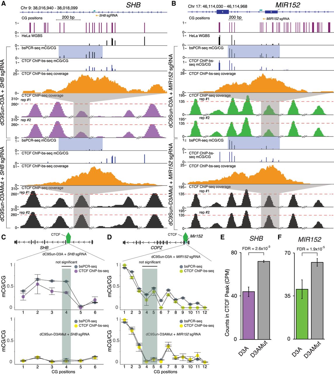 Impact of targeted DNA methylation induction on CTCF binding. (A) Genome Browser display of targeted CTCF binding site in an SHB intron. Sets of experiments include (from top to bottom): targeted bsPCR-seq (fraction mCG/CG), CTCF-ChIP-bs-seq (fraction mCG/CG), CTCF-ChIP-bs-seq coverage, and CTCF ChIP-seq coverage. CTCF core binding site is highlighted in shaded green. CTCF ChIP-seq coverage (TMM normalized counts) is shown with adjacent peaks for reference (broken x-axis). Red dotted line is set to maximum targeted CTCF peak in the control samples. (B) Genome Browser snapshot of targeted CTCF binding site upstream of MIR152. (C,D) Quantitation of mCG/CG in CTCF core binding site (green shaded region) and adjacent to core binding site comparing targeted bsPCR-seq (gray circles) to ChIP-bs-seq (purple or green circles for αGCN4-D3A and yellow circles for αGCN4-D3AMut) for SHB and MIR152, respectively (replicates n = 2; error bars, SD; Fisher's exact test). (E,F) Quantitation of CTCF CPM normalized ChIP-seq peak at SHB and MIR152, respectively (replicates n = 2; error bars, SD; statistic edgeR, Benjamini-Hochberg multiple test corrected P-values).