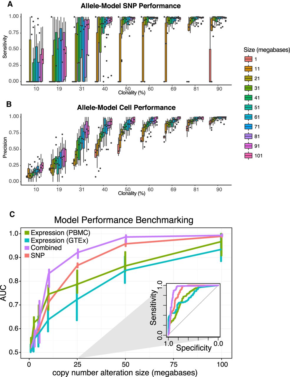 HoneyBADGER performance as a function of clonality and CNV size. (A) Allele-model sensitivity for identifying SNPs affected by deletion. (B) Allele-model precision for distinguishing tumor (cells with deletion) from normal (cells without). (C) Prediction performance of HoneyBADGER's posterior probability estimates as a function of deletion size. Four different HoneyBADGER models are shown using different colors: expression-only model with PBMC and CD19+ expression normalization reference (green); expression-only model with normal blood GTEx expression normalization reference (blue); expression and SNP combined model (purple); and SNP-only model (red). Inner quartile range is indicated by the vertical lines. Performance was quantified by ROC AUC. (Inset) Representative ROC curves for a simulated 25-Mb deletion.