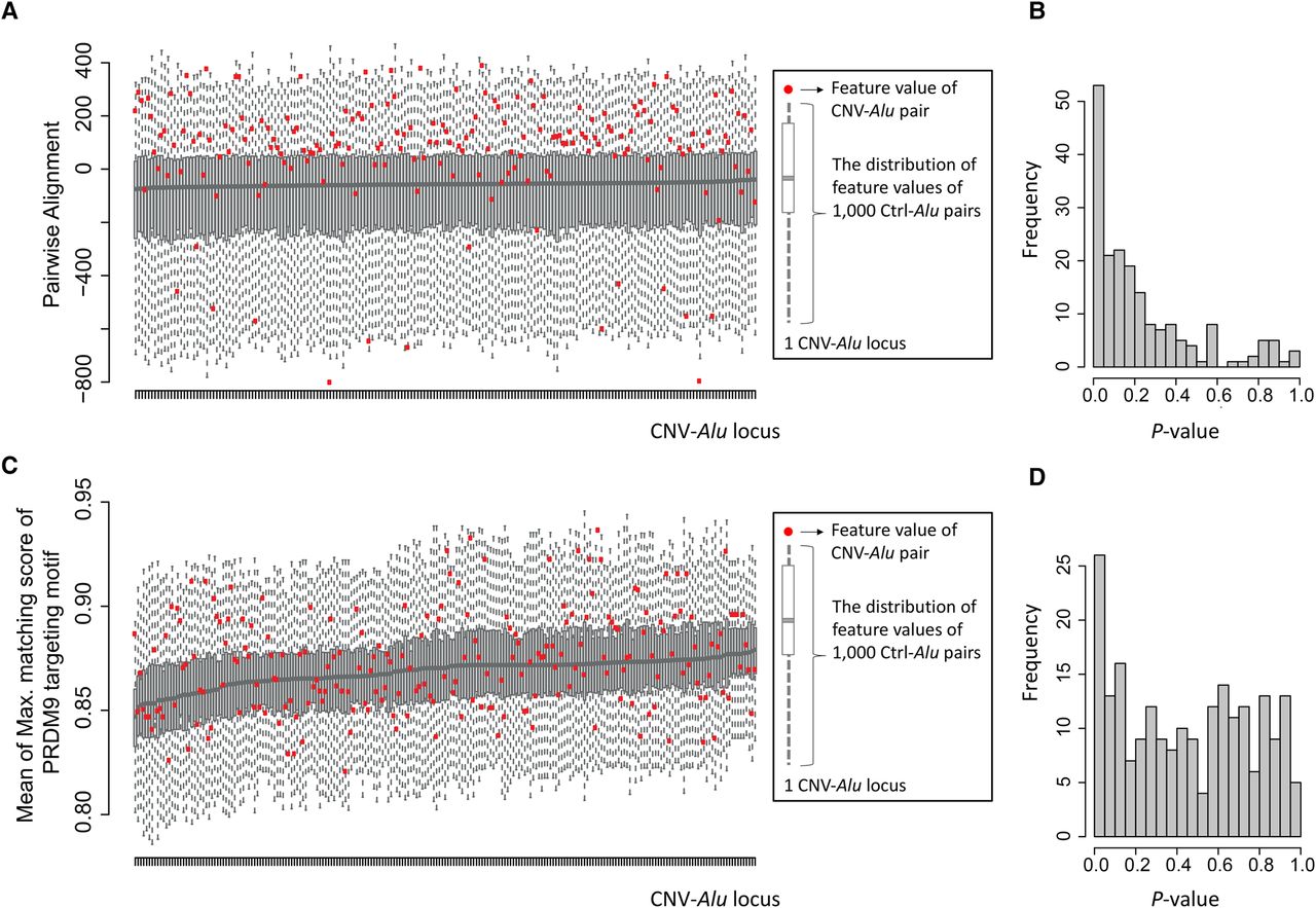 Determining feature enrichment for CNV-Alu pairs with respect to Ctrl-Alu pairs. (A) The comparison of pairwise alignments between CNV-Alus (n = 219) and the corresponding Ctrl-Alu pairs (n = 1000 per CNV-Alu) is shown. The y-axis is a score showing the alignment performance, a higher value of which indicates a better alignment between two sequences. As shown in the key, at each locus, we displayed the alignment score of CNV-Alu with a red dot and showed the distribution of the Ctrl-Alus with a boxplot. The information of all the 219 events is summarized in an increasing order of the median value of the Ctrl-Alus. (B) The distribution of P-values calculated using Monte Carlo simulation for pairwise alignment is shown. (C,D) The same strategy was adopted for analyzing the mean value of the maximum matching score of the PRDM9 targeting motif within an Alu pair.