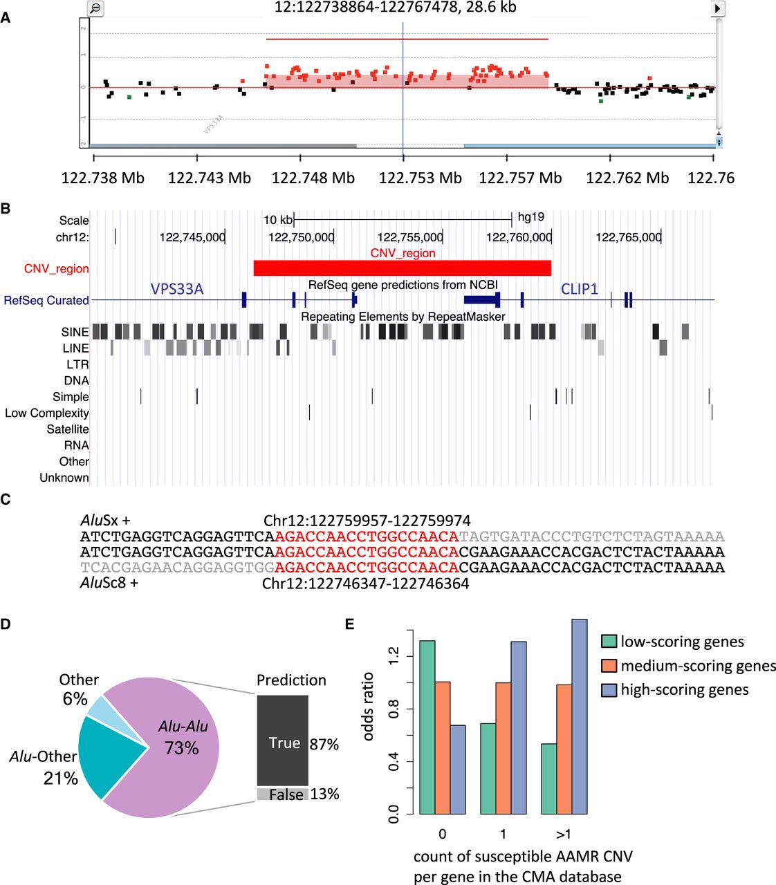 Experimental and computational validation of AAMR hotspot prediction. (A) High-density aCGH results from one individual selected from the CMA database shows a duplication of the two terminal exons of CLIP1, a predicted AAMR hotspot gene. Red dots signify probes that indicate relative copy number gain (the region indicated contains a duplication); black dots, a region unaffected by CNV; and green dots, deletion. (B) The UCSC Genome Browser image depicts RefSeq genes and RepeatMasker annotations within the same genomic interval as shown in the aCGH result. The red block represents the duplicated region. The two SINE elements, AluSc8 and AluSx, in which the breakpoints of this CNV are located are marked with red arrows. (C) The first line of sequence shows the reference sequence of the AluSx; the middle line, the sample sequence; and the bottom line, the sequence of the AluSc8. The sequences are on the plus strand, and both Alus are in the plus orientation. The sequence of microhomology at the breakpoint junction is highlighted in red. The gray sequence starts from the first mismatching base. The genomic coordinates of the microhomologies are annotated in the hg19 assembly. (D) A chart summarizing 52 breakpoint junctions mapped at nucleotide level is depicted. The CNVs are grouped into three types: Alu-Alu, CNVs mediated by an Alu pair; Alu-Other, Alu pairing with a non-Alu sequence, including LINE, LCR, and nonrepeat/repetitive sequence, mediates the CNV formation; and Other, no Alu elements were involved. For those mediated by an Alu pair, the QDA prediction result is shown to the right. True prediction indicates these Alu pairs were predicted as high risk for AAMR. (E) A box plot showing the enrichment of genes within different risk score tertiles among three classes of the count of susceptible AAMR CNVs in the CMA database.