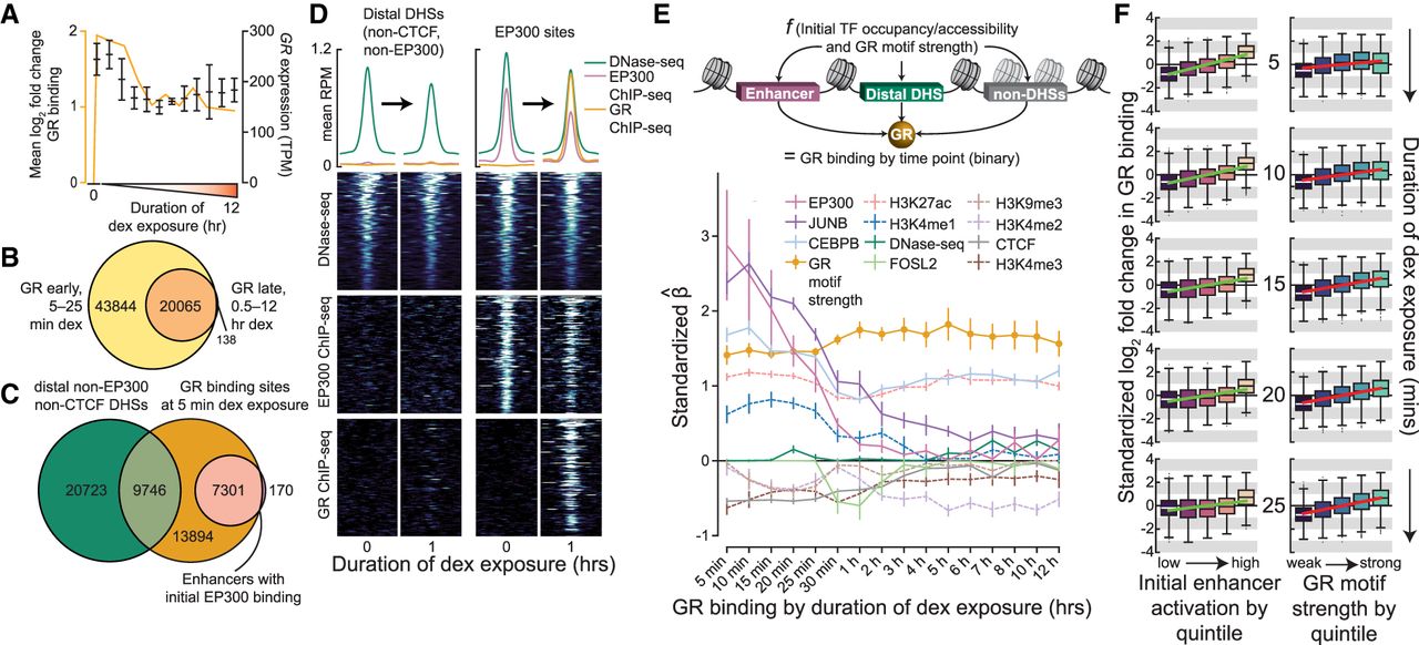 Chromatin accessibility does not predetermine GR binding. (A) Line plot shows mean log2 fold change in GR binding in enhancers over time course (orange) as well as the expression of GR over the time course (black) as assayed by RNA-seq, quantified at the gene-level, and measured in transcripts per million (TPM). Error bars, SD across replicates. (B) Venn diagram shows overlap of GR ChIP-seq peaks called at early dex exposure time points (5–25 min) and at late time points (0.5–12 h). (C) Venn diagram shows the number of distal non-EP300-/non-CTCF-bound preaccessible DHSs and enhancers with initial EP300 binding within 500 bp of GR binding sites at 5 min of dex exposure. (D) Heatmaps show DNase-seq and input-subtracted ChIP-seq signal in reads per million (RPM) in chromatin accessibility-matched distal non-EP300-/non-CTCF-bound preprogrammed DHSs (left) and preprogrammed EP300 sites (right). Above, aggregate profile plots show mean RPM per base pair across sites in heatmaps. Regions shown range from −1 to +1 kb from site center. (E) Schematic of elastic net regression model (top) is shown along with estimated nonzero coefficients (below) across the time course. Error bars, SD of coefficient estimates across 1000 bootstrap samples. (F) Box-and-whisker plots show log2 fold change in standardized GR binding every 5 min for the first 25 min across the set of all enhancers split into quintiles either by initial enhancer activation (left) or by GR motif strength (right). Observations greater than 1.5× interquartile range beyond the first or third quartiles are shown as outliers. Ordinary least squares regression lines are shown in green and red.