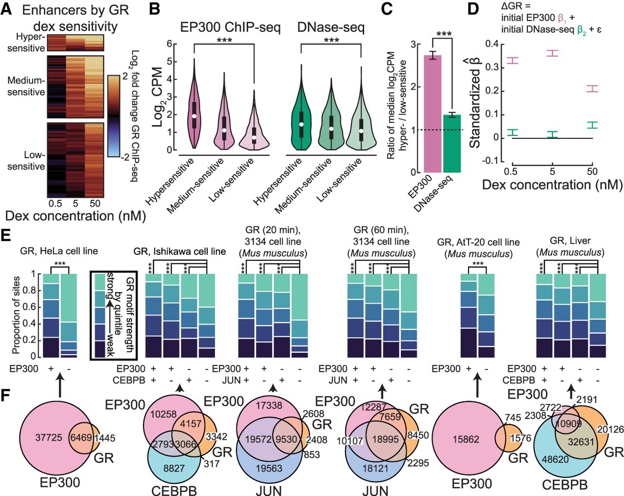 GR binds to enhancers across cellular contexts. (A) Change in GR binding shown for three classes of enhancers defined by GR binding responsiveness to varying dex concentrations. (B) Initial abundance of EP300 ChIP-seq (left) and DNase-seq (right) in enhancers by classes in A. Abundance in log2 counts per million (log2 CPM). (***) P < 0.001. (C) Ratio of log2 CPM EP300 ChIP-seq and DNase-seq in dex hypersensitive versus low-sensitive sites. (***) P < 0.001. (D) Estimated coefficients of a series of linear models regressing change in GR binding by dex concentration on initial EP300 ChIP-seq abundance and initial DNase-seq abundance after standardizing all variables (equation shown above). (E) Sets of GR binding sites across a variety of cellular contexts were split into quintiles by GR motif strength. Bar plots show the proportions of GR sites by intersection with EP300 sites and selected TF sites that fall within each quintile. (***) P < 0.001. (F) Venn diagrams show overlap of GR binding sites with EP300 sites and selected TF sites across a variety of cellular contexts corresponding to E.