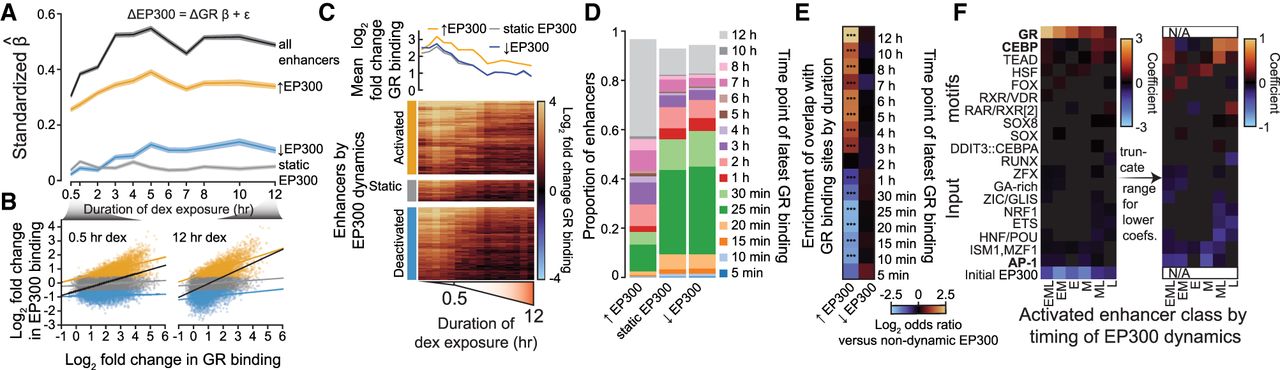 Direct GR binding drives changes in EP300 binding in enhancers. (A) Lineplot displays estimated coefficients in regression of change in EP300 binding on change in GR binding in enhancers. Either all enhancers were used to fit model (black) or subsets of enhancers based on EP300 dynamics, which are displayed as indicated. Standard errors of coefficients shown as semitransparent ribbon. (B) Scatter plots compare log2 fold change in GR binding and in EP300 binding in enhancers at 0.5 and 12 h of dex exposure. Separate regression lines are shown with 95% confidence bands for each enhancer class indicated in A. (C) Heatmap shows the log2 fold change in GR binding in enhancers with increased, nondynamic, and decreased EP300 hierarchically clustered by complete linkage and sorted in descending order by change in binding (below). Discontinuity in x-axis label indicates where sampling frequency shifts from every 5 min to approximately every hour. Line plot shows mean across all enhancers by dynamics class (above). (D) Bar plot displays the proportion of enhancers, by EP300 dynamics class, that overlaps GR binding sites by the last time point at which GR was observed to bind above background. (E) Heatmap shows the log2 odds ratio of enrichment of overlap to the GR binding site sets in D for enhancers with dynamic EP300 versus enhancers with nondynamic EP300. (F) Heatmap shows elastic net logistic regression coefficients for RSAT-clustered JASPAR TF motifs with nonzero coefficients in the prediction of gains in EP300 by dynamic class. Each column represents results from an independent model where enhancer sets were split by time of increased EP300 binding as in Supplemental Figure S4B and the background set was all enhancers with decreased or nondynamic EP300.