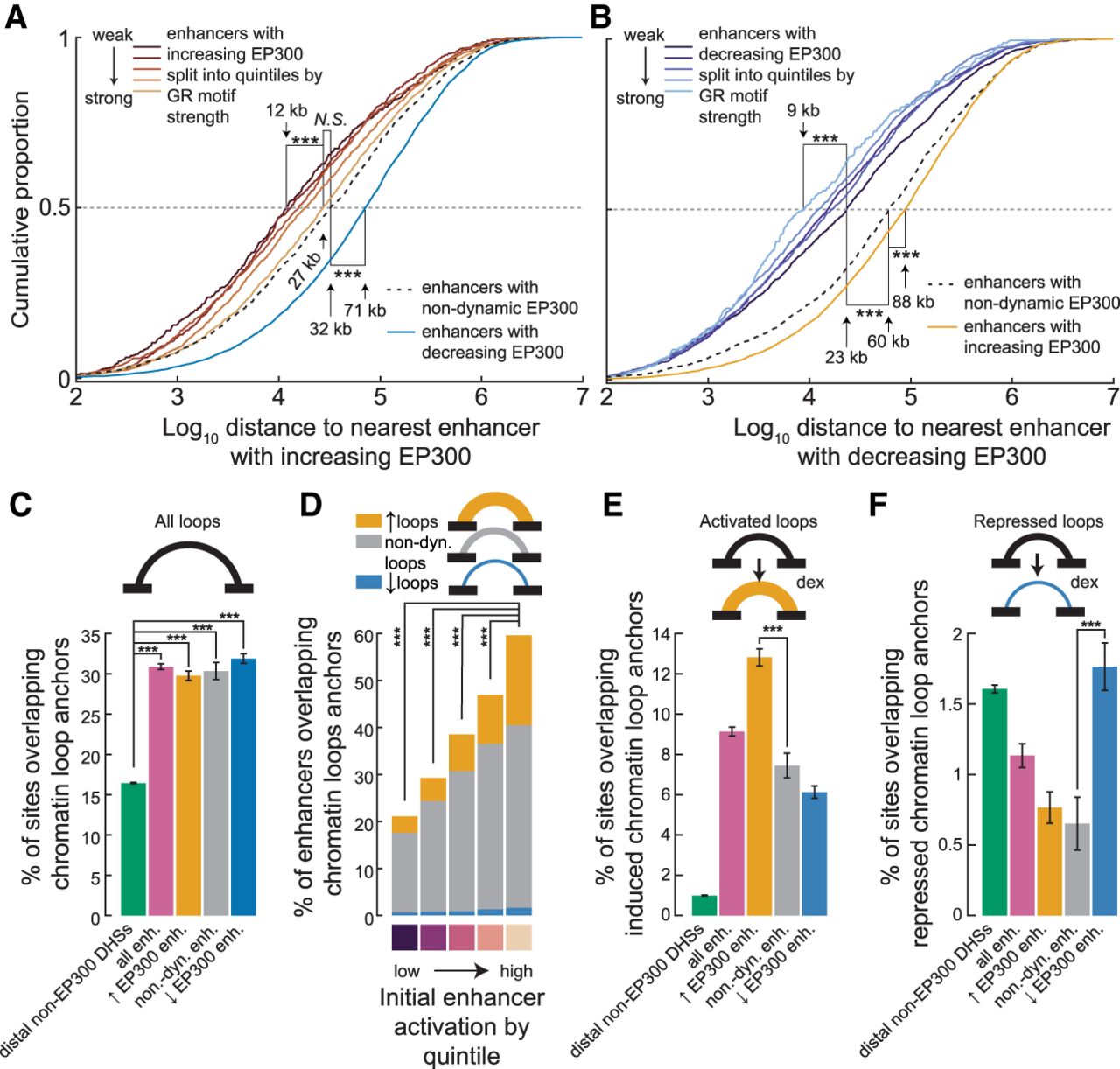 Enhancer dynamics are dependent across neighboring enhancers and coordinated by chromatin looping. (A) Cumulative distribution of distance to nearest neighboring enhancer with increased EP300 by EP300 dynamics class, where enhancers with increased EP300 were additionally split into quintiles by GR motif strength. (***) P < 0.001; N.S. = P > 0.01. (B) Cumulative distribution of distance to nearest neighboring enhancer with decreased EP300 by EP300 dynamics class, where enhancers with decreased EP300 were additionally split into quintiles by GR motif strength. (***) P < 0.001. (C) Barplot shows the percentage of sets of sites that overlap with chromatin loop anchors. Error bars, SE of percentage computed from the normal approximation of a binomial proportion. (***) P < 0.001. (D) Same as C, except with a specific focus on enhancers, which were split by initial enhancer activation as estimated by the principal component decomposition of flanking H3K4me1 and H3K27ac occupancy. (E) Same as C, except only anchors of induced loops considered. (F) Same as C, except only anchors of repressed loops considered.