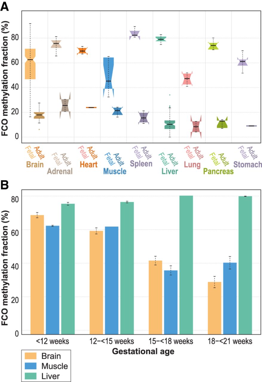FCO methylation signature deconvolution in fetal/embryonic and adult tissues. Panel A compares the estimated FCO methylation fraction between fetal/embryonic and adult tissues. In the boxplots: (1) The box shows the interquartile range (IQR), (2) the whiskers show the inner fences (1.5 × IQR out of the box), (3) the bolded line shows the median of the data, and the notches-horns display the 95% confidence interval of the median. Panel B compares the estimated mean FCO methylation signature in three fetal/embryonic tissues in four gestational periods: Brain and muscle showed a marked reduction of the signature after the 15th week of gestational age. In contrast, fetal/embryonic liver showed a persistently high level of the FCO signature.