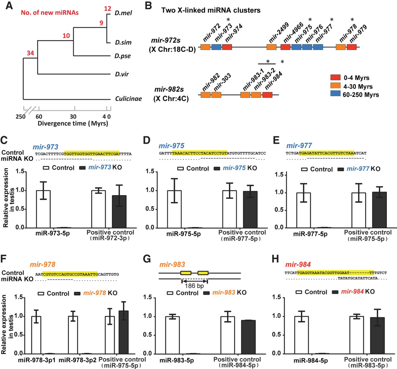 Emergence of de novo miRNAs and the creation of knockout (KO) lines. (A) The emergence of new miRNAs in Drosophila. The numbers in red indicate miRNA emergence in each time interval of Drosophila phylogeny. Note the “pyramid” age structure with many very young miRNAs, suggesting many deaths before aging. The age distribution is sourced from our previous study (Lyu et al. 2014). (D. mel) D. melanogaster; (D. sim) D. simulans; (D. pse) D. pseudoobscura; (D. vir) D. virilis. (B) miRNA mutants in this study fall into two de novo miRNA clusters. De novo miRNAs tend to be in clusters and are X-linked (Lyu et al. 2014). (*) The six knockout creations of the two clusters of focus. Colors denote miRNA age as indicated. (C–H) Verification of miRNA knockout efficiency. Upper: DNA sequences of miRNA KO strains with the mature sequences highlighted in yellow. Lower: relative expression of miRNAs in the testis. No miRNAs are detectable in the KO lines, whereas the expressions of the neighboring miRNAs are normal (positive controls). Note that mir-978 has two 5′ iso-miRNAs (miR-978-3p1 and miR-978-3p2), which are processed from one precursor in the D. melanogaster testis.