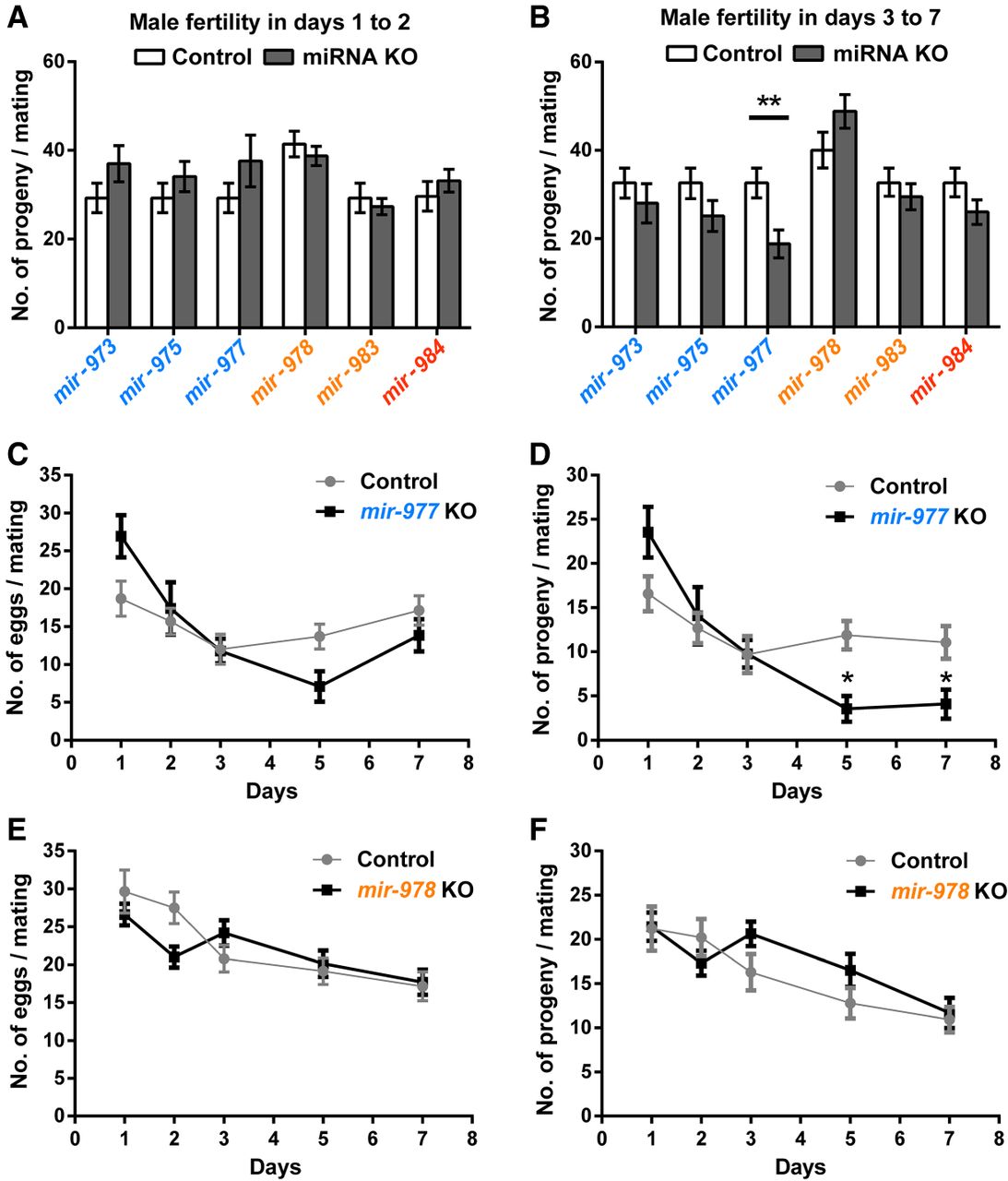 Relative fertility in miRNA KO lines. After mating with either wild-type or miRNA KO males, females are permitted to lay eggs for 7 d. (A) Number of progeny in the first 2 d. (B) Number of progeny in days 3–7. Overall, the fertility differences between wild-type and KO males are small. The three older miRNAs seem to have a larger impact on days 3–7, whereas the younger miRNAs do not show a consistent pattern. Except for mir-977, none of the differences is significant: (**) P < 0.01, Student's t-test. (C,D) Day-to-day fertility analyses of mir-977 for egg laying and progeny count, respectively. Mean ± SEM is shown. Fertility differences between wild-type and KO males are significant in later days (multiple t-tests with the Holm-Sidak correction, P = 0.0009 on day 5 and P = 0.011 on day 7). (E,F) Day-to-day fertility analyses of mir-978. There is a slight but insignificant decrease during the first 2 d and a slight increase in subsequent days for the KO line.