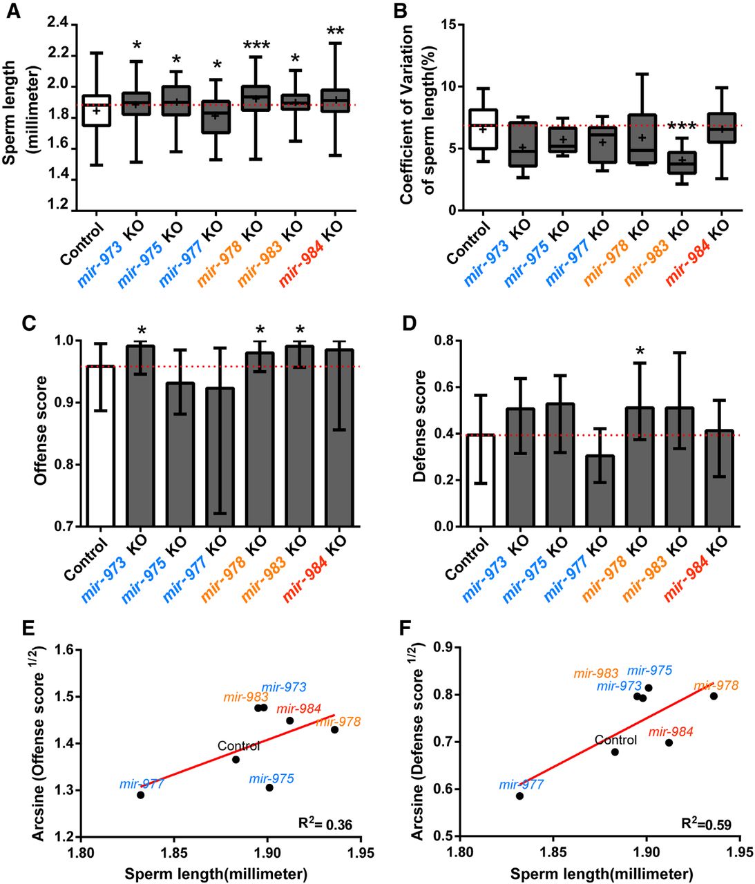 Sperm length and sperm competition. (A) Sperm length of miRNA KO and control males. Sperm length is recorded for 9–11 individuals with 9–13 sperm measured per individual. Except for mir-977, all miRNA KO lines have significantly longer sperm compared to the control (Mann-Whitney U test). (B) Coefficient of variation (standard deviation/mean) of sperm length. All miRNA KO males tend to have sperm of more homogeneous length, especially mir-983 KO (Mann-Whitney U test, P < 0.001). (C,D) Sperm competition assay. Defense score represents the ability of the interested males in siring progeny when they mate with females that subsequently remated. Offense score is the reverse (see text). In all cases in which the control and KO males are significantly different (Mann-Whitney U test, P < 0.05), KO males have a higher fitness. (E,F) Linear regression of the median value from the sperm competition assay on the median sperm length. Angular transformation is applied to the defense and offense scores. Sperm length indeed has an impact of sperm competitiveness, and the trend is stronger for defense than for offense. (*) P < 0.05; (**) P < 0.01; (***) P < 0.001.
