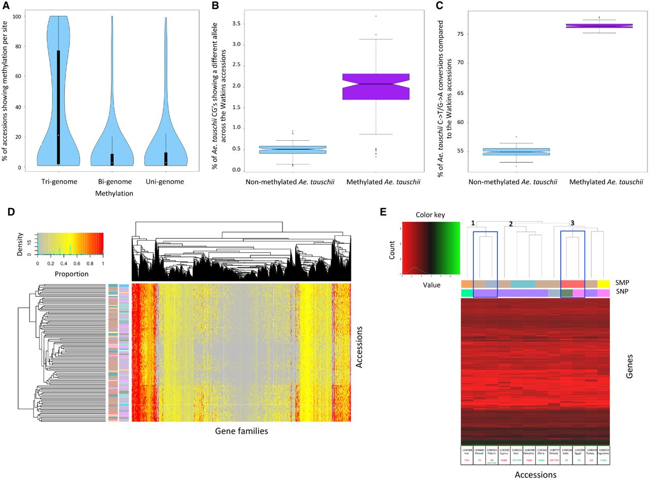 Analyzing methylation profiles across the Watkins collection. (A) Violin plots show the percentage of accessions showing methylation per site. Analyzed sites include Tri-genome, Bi-genome, and Uni-genome methylated sites. A comparative subset of 11,769 sites was used for each category. (B) Ancestral methylation associates with an increased SNP rate. The percentage of methylated versus nonmethylated Aegilops tauschii cytosines that show a different allele in Watkins. (C) Ancestral methylation demonstrates that 5-methylcytosines are preferentially deaminated to thymine. The percentage of methylated versus nonmethylated Ae. tauschii cytosines with a C-to-T/G-to-A transition across the Watkins collection. (D) Accession clustering based on the gene families targeted by methylation. Many accessions from the same geographical origin show the same gene families targeted by methylation and are, thus, clustered close to each other in the Accessions axis (vertical dendrogram). Alongside the vertical dendrogram, the two columns of row barcodes (left and right) correspond to the SMP clusters in Figure 1D and SNP clusters in Figure 1B, respectively. (E) Clustering of the 12 accessions subjected to RNA-seq using average gene expression across the replicates for genes showing differential expression between at least two lines (after log2 transformation). The horizontal dendrogram has its three main clades labeled 1, 2, and 3. Below the horizontal dendrogram, the two barcode rows (top and bottom) correspond to the SMP and SNP clusters in Figure 1, D and B, respectively. Accessions are labeled by line number, country of origin, and phenotype, i.e., TGW (thousand grain weight), HD (heading date), GW (grain width), or Height, with maximum values in green and minimum values in red. Accessions showing the phenotypic tails for heading date that are of interest within this study are highlighted on the horizontal dendrogram with a blue box.