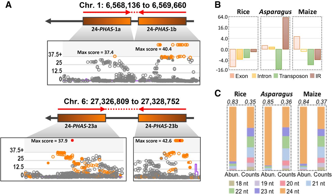 Many Asparagus 24-PHAS loci are derived from inverted repeats. (A) Genomic organization of two representative IR-type PHAS loci, overlapping with the 5′ and 3′ arm of inverted repeats. Phasing scores from sliding window analysis are presented as shown in our custom web viewer. Loci with score >25 were considered as phased loci. (B) Fold change representing enrichment or depletion of overlap of 24-PHAS loci from rice, Asparagus, and maize, with exons, introns, transposons, and inverted repeats, versus random chance. The complete data are in Supplemental Table S5. (C) Comparison of sRNA abundances and unique sRNA counts of sRNAs produced from 24-PHAS loci from rice, Asparagus, and maize. The values on top represent 2.5% trimmed mean of ratio of abundances or counts of 24-nt phasiRNAs from all 24-PHAS loci of corresponding species.