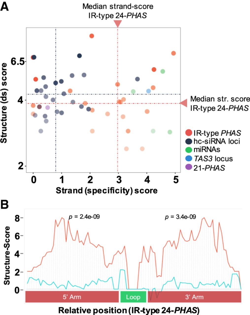 Intramolecular secondary structure at inverted repeat, 24-nt PHAS loci in Asparagus. (A) Scatterplots showing secondary structure scores as function of strand-specificity scores for IR-related loci along with randomly selected hc-siRNA, miRNA, tasiRNA, and IR-type 21-nt loci that passed the coverage cutoff. The dotted line represents score medians: (red) 24-nt PHAS loci; (blue) hc-siRNAs. (B) Consensus of dsRNA structure scores (red) from five IR-type PHAS loci show two statistically significant peaks of paired nucleotides and a “valley” (loop, green) of unpaired nucleotides validating formation of stem–loop structure from these IR-type PHAS transcripts. The five loci for this figure were selected based on high coverage and similar lengths and loop sizes. The control (blue line) represents the mean score from shuffled controls. Methods used to compute secondary structure scores are described in the Supplemental Methods.