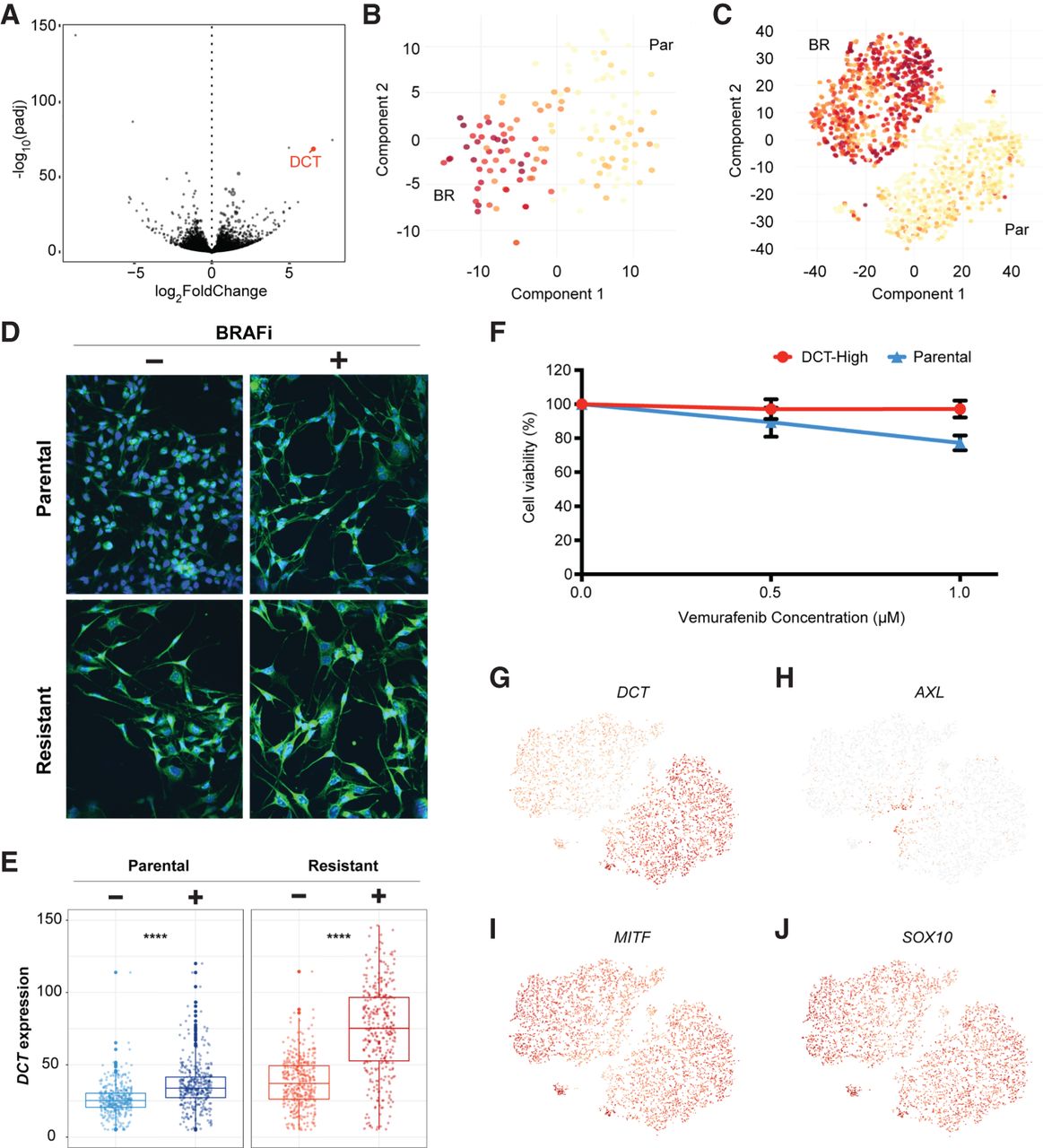 DCT marks 451Lu melanoma cells intrinsically resistant to BRAFi drug treatments. (A) A Volcano plot displays adjusted −log10(P-value) versus log2FoldChange between BRAFi-resistant and parental cells, which identified DCT as one of the strongest markers of the resistant population. t-SNE maps were used to display the DCT expression levels from data generated through Fluidigm C1 platform (B), and the 10x Genomics sequencing technologies (C). (D,E) Most of the resistant cells had higher levels of DCT compared with the parental cells. Cells were stained with a fluorescent-labeled DCT antibody (green) and counterstained with DAPI (blue). BRAFi-resistant cells show higher expression of DCT at the protein level, quantified in the box plots of E. (F) MTT assays measured metabolically active cells 48 h after application of BRAFi to the media. DCT-positive cells, isolated by FACS from the 451Lu parental population, show significantly reduced response to BRAFi and higher survival rates. (G) DCT shows a binary expression pattern, with high levels in BRAFi-resistant single cells. (H–J) Previously published markers of BRAFi resistance do not show similar binary expression patterns across cell populations.