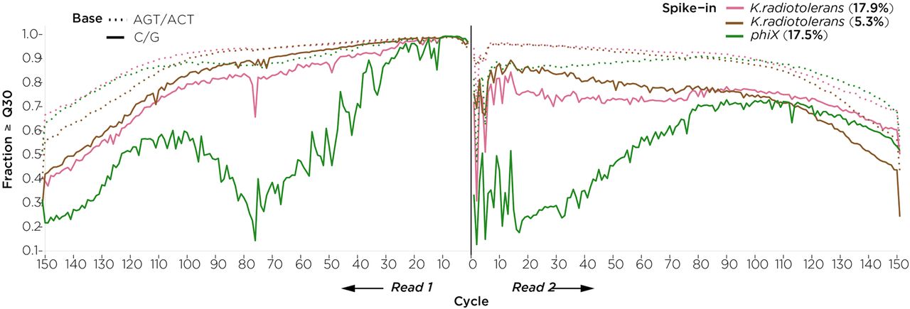 Improved quality of whole-genome bisulfite sequencing (WGBS) with Kineococcus radiotolerans used as a spike-in. The plot shows the proportion of reads at or above a quality score of 30 for read 1 (left) and read 2 (right). The pink lines show the performance of K. radiotolerans (G + C = 0.74) added at a proportion of 17.9% (light pink) or 5.3% (dark pink), and PhiX (G + C = 0.44, green). The results are plotted to show the quality for C/G (solid lines) separately from other nucleotides (dotted lines), as the performance of WGBS is especially problematic for C/G nucleotides, a fact missed by plots that do not separate out these nucleotides. The high (G + C) K. radiotolerans spike-in, even at 5.3% proportion, restores C/G quality to levels comparable with the other nucleotides.