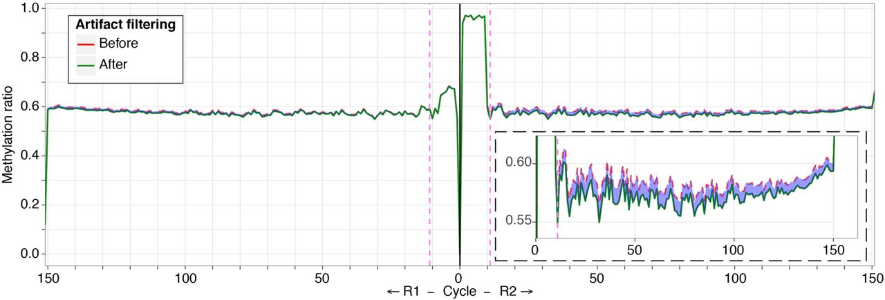 A subset of reads shows apparent cytosine methylation throughout their lengths, in CG and CH dinucleotide contexts. Our use of 5mC for end repair reveals the expected ∼10-bp increase in the C/T ratio (y-axis) in read 1 (right). However, prompted by our finding of unconverted cytosines in lambda DNA, we tested whether any of the reads had a pattern of unconverted cytosines in all dinucleotide contexts (the expected CG and the uncommon CH contexts). We found a subset of reads in which no cytosines were converted. To categorize these, we developed the filterFillIn2 software to identify four consecutive unconverted cytosines in a CHH context. The effect on DNA methylation values is shown in the C/T plots, the original values in red and following removal in green. The inset shows that ∼1%–2% of the DNA methylation value is accounted for by this artifact.