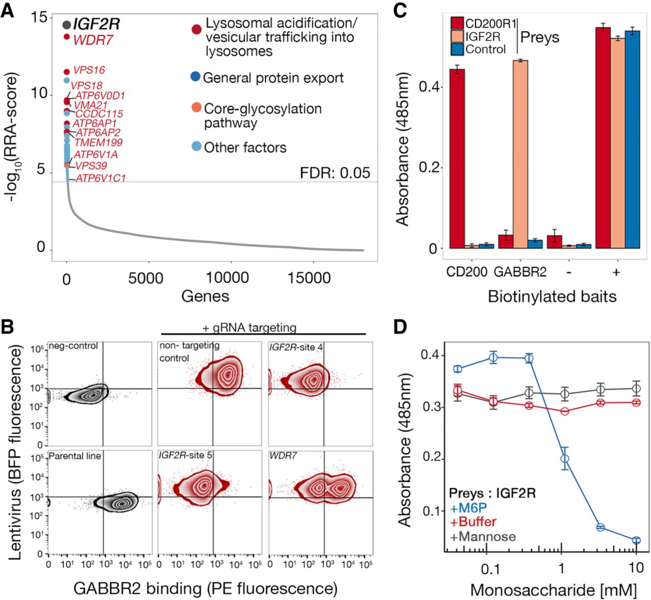 IGF2R interacts with GABBR2 in a mannose-6-phosphate (M6P)–dependent manner. (A) RRA-score rank-ordered genes identified from gRNA enrichment analysis from sorted mutant cells that had lost GABBR2 binding activity. Enriched genes encoded the IGF2R receptor and proteins involved in lysosome biology (also see Supplemental Data S3). (B) Binding of GABBR2 was quantified on HEK293 cells transduced with two gRNAs targeting different exons of IGF2R and one gRNA targeting WDR7. A near complete loss of binding was observed on IGF2R-targeted cells and a partial loss on WDR7-targeted cells; targeted cells were maintained as polyclonal lines. A representative experiment of three technical replicates is shown. (C) Direct binding between IGF2R and GABBR2 ectodomains. The biotinylated ectodomain of GABBR2 was immobilized as a “bait” on streptavidin-coated microtiter plates and tested for direct interactions using a beta-lactamase–tagged “prey” ectodomain of IGF2R. Binding was quantified using the beta-lactamase substrate nitrocefin, whose hydrolysis products absorb at 485 nm. Positive control was the CD200–CD200R1 interaction; control “prey” is an unrelated ectodomain, positive (+) represents total capture of all preys with an anti-prey antibody, and negative (−) represents a tag-only bait control. (D) The interaction between IGF2R and GABBR2 can be completely inhibited by 10 mM soluble M6P. The binding dependency on M6P was tested by adding serial dilutions of mannose, M6P, or buffer alone. Data points in C and D are mean ± SEM, n = 3.