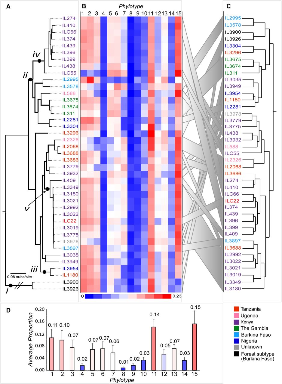 Relationships between the VSG repertoire, geography, and population structure in T. congolense. (A) ML phylogeny of T. congolense strains in this study based on whole-genome single-nucleotide polymorphisms (SNPs), estimated with RAxML (Stamatakis 2014) with a GTR + Γ model and 100 bootstrap replicates (branches with bootstrap greater than 70 are shown in bold). Labels “i” to “v” denote examples referred to in the text. Label “i” shows the long phylogenetic distance between T. congolense Savannah and Forest subtypes; “ii” points to the only clade maintaining a geographic signature. Labels “iii,” “iv,” and “v” show examples of lack of concordance between the population history recapitulated by the SNP phylogeny and the VAP, demonstrated by the dendrogram. (B) VAPs for all strains shown as a heatmap of the proportions of 15 universal phylotypes. (C) A dendrogram depicting the relationships among VAPs based on Euclidian distances estimated in R. Gray ribbons link the position of parasite strains in A and C. (D) A bar chart showing the average proportion of each phylotype (mean ± σ) across all strains. Strains are color-coded by provenance according to the key.