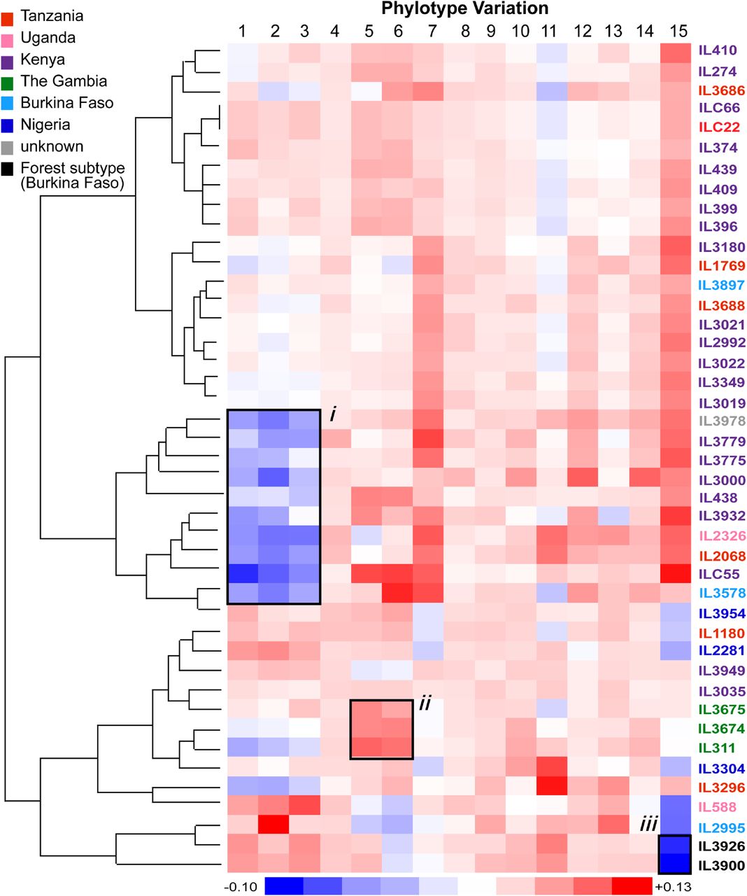 Phylotype variation across the sample cohort. The heatmap represents phylotype variation across the sample cohort expressed as the deviation from the mean. The dendrogram reflects the relationships among the VSG repertoires of each strain. Strains are color-coded by location of collection according to the key. Labels “i” to “ii” denote examples of phylotype variation signatures referred to in the text. Label “i” shows a pattern of underrepresented P1-3 among strains of multiple countries; “ii” shows a pattern of overrepresented P5-6 in Gambian isolates; “iii” shows a pattern of underrepresented P15 common to Forest-subtype isolates.