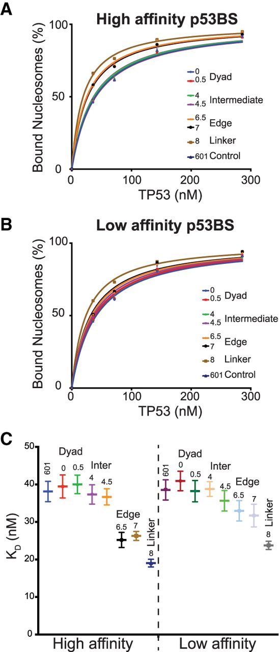 TP53 has higher affinity to p53BS near nucleosome boundaries. (A–C) The sequence results for the nucleosome bands were used to determine the binding affinities, KD, with nonlinear regression. (A) The percentage of nucleosomes bound by TP53 as TP53 is titrated. The location of the high-affinity p53BS is indicated. (B) The percentage of nucleosomes bound by TP53 as TP53 is titrated. The location of the low-affinity p53BS is indicated. (C) KD values with standard errors were plotted for each nucleosome.