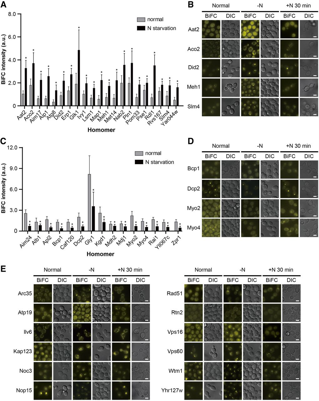 Changes in protein homomerization upon nitrogen starvation. (A,C) Protein homomers showing increased (A) or decreased (C) BiFC signals upon nitrogen starvation. Gray and black bars indicate the mean BiFC signal intensity of protein homomers under the normal conditions and nitrogen starvation, respectively. Error bars, SD. Asterisks indicate significant differences compared with the normal conditions (Student's t-test): (*) P < 0.05. For detailed information, see also Supplemental Table S11. (B,D,E) Representative BiFC images of protein homomers showing increased (B), decreased (D), or localization-changed (E) BiFC signals upon nitrogen starvation and restored signals after transfer to nitrogen-containing medium. Scale bars, 2 µm.