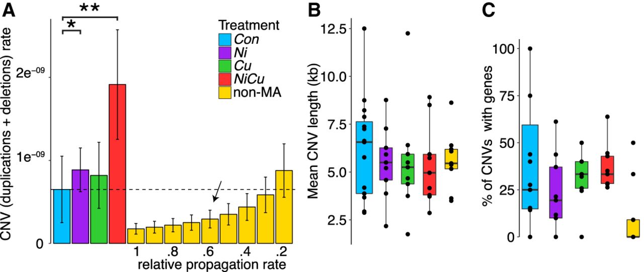CNV rates and lengths, with and without selection. (A) Mean CNV rates (sum of duplications and deletions per nucleotide per generation) and standard errors among MA treatment groups showing significant differences among treatments: (*) P < 0.01; (**) P < 0.005. A comparison with non-MA isolates given various relative propagation rates compared to MA lines is shown, with a dotted line indicating the relative propagation rate in non-MA genomes to reach the same mutation rates as in control MA lines. We estimated the relative propagation rate based on a life history experiment (indicated with an arrow). (B) Box plot of CNV length distributions across treatments. (C) The percentage length of CNV regions that overlap genes, in which only a single non-MA isolate has genes deleted, and two more isolates had a gene duplication.