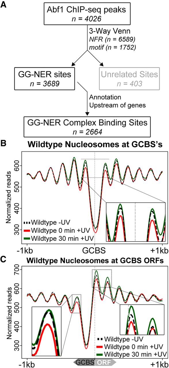 Identification of the genomic list of GCBSs and the nucleosome occupancy in relation to these sites. (A) Flow chart to illustrate the bioinformatics analysis performed to identify genome-wide GCBSs by refining and filtering the list of Abf1 ChIP-seq peaks using NFR positions, motif sites, and annotation information. (B) MNase-seq data of wild-type cells were used to plot cumulative nucleosome positions around GCBSs (n = 2664) in the absence of UV irradiation and at different intervals after UV irradiation, displaying regularly spaced nucleosome arrays at these genomic locations. The x-axis denotes the 2-kbp regions surrounding the GCBSs, while the y-axis indicates nucleosome occupancy as measured by normalized reads. (C) Nucleosome occupancy in wild-type cells before and after UV damage. MNase-seq data of untreated and UV-treated cells are shown as cumulative graphs around GCBSs in relation to ORF structure. The insets highlight the nucleosome remodeling at the −1 position (left) and the remodeling at positions +1 and +2 (right).