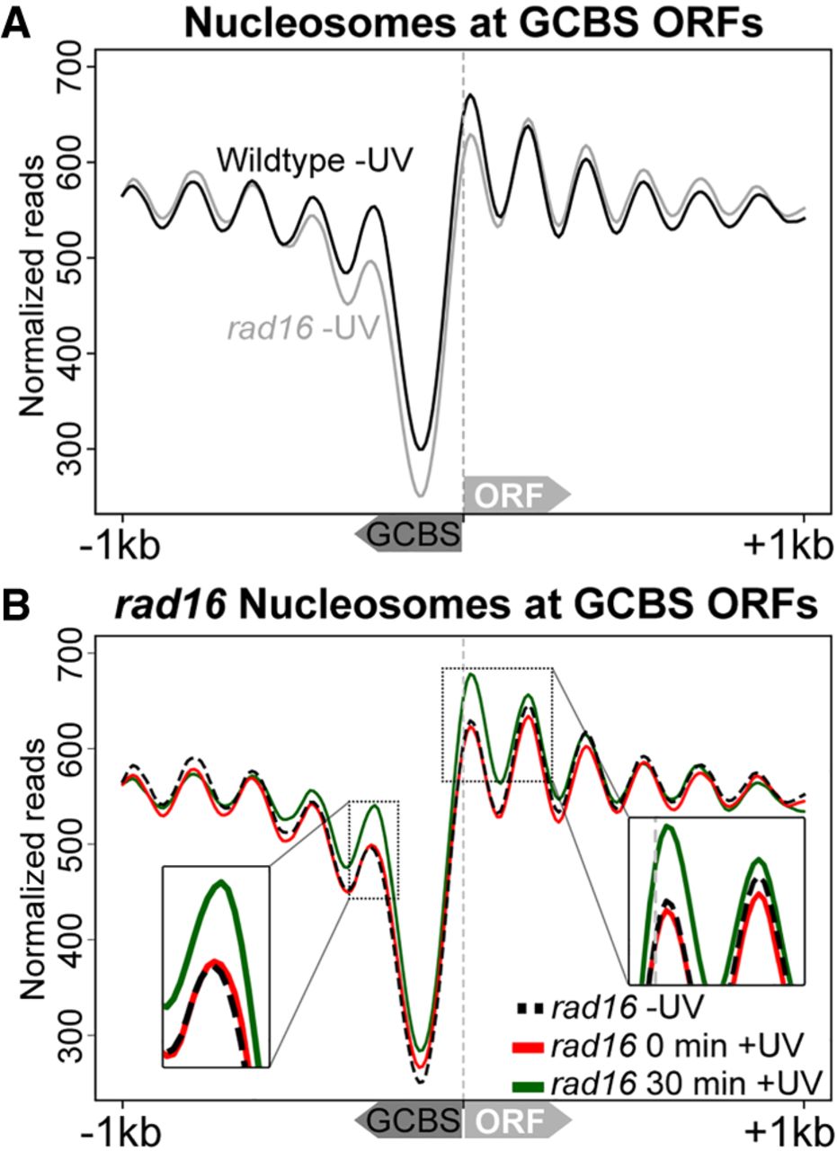 GG-NER complex adjacent nucleosomes are established and remodeled following UV irradiation in a Rad16-dependent fashion. (A) MNase-seq data of wild-type and rad16 mutant cells were used to plot cumulative nucleosome positions around GCBSs (n = 2664) in the absence of UV irradiation. The annotation of the nearest gene was used to infer strand information to align these genomic positions according to gene orientation as indicated by the arrows on the x-axis depicting the relative direction the GCBS and ORF. The x-axis denotes 2-kbp regions surrounding the GCBSs, while the y-axis indicates nucleosome occupancy as measured by normalized reads. (B) As described in A, but showing UV-induced changes to nucleosome positions around GCBSs and accompanying ORFs in rad16-mutated, GG-NER–defective cells.