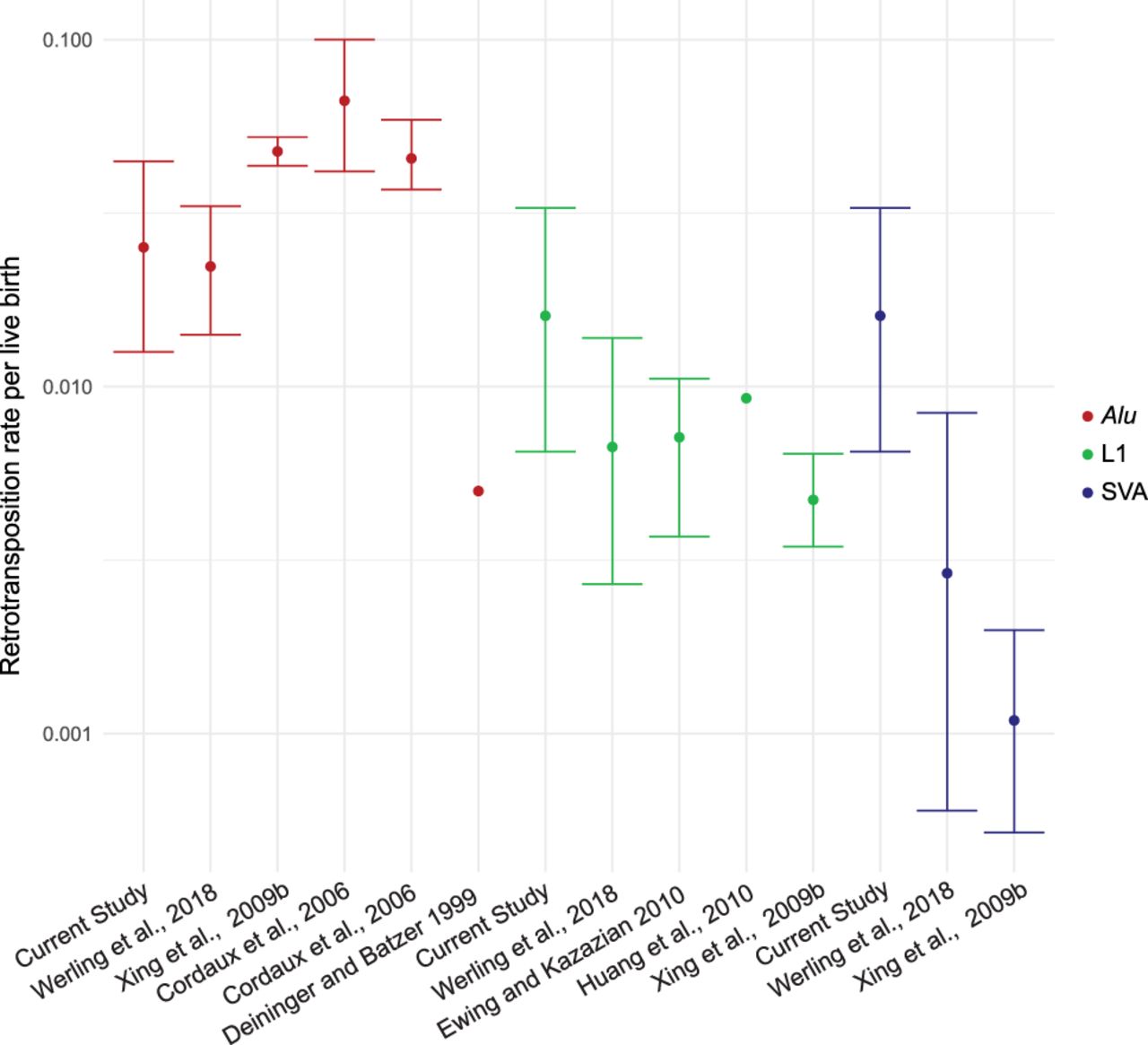 Estimated retrotransposition rates. Estimated retrotransposition rates for previous studies are listed (Deininger and Batzer 1999; Cordaux et al. 2006; Xing et al. 2009b; Ewing and Kazazian 2010; Huang et al. 2010). Confidence intervals are shown if available from the study. Rates and binomial 95% CI were determined for Werling et al. (2018) and this study. Alu element rates are shown in red, L1 in green, and SVA in blue.