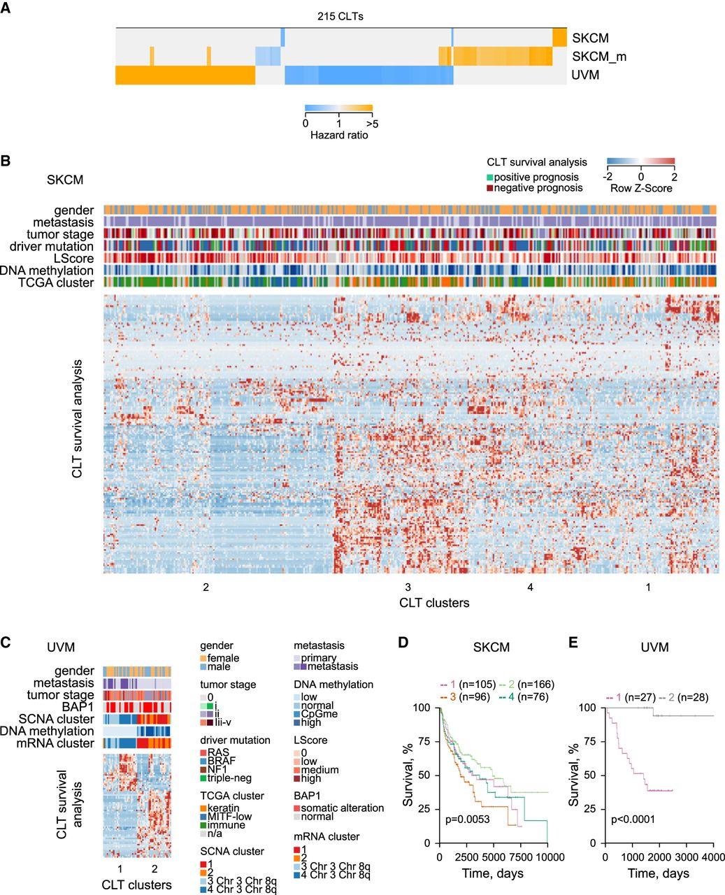 Potential biological processes underlying melanoma association of melanoma-expressed CLTs. (A) Heatmap of hazard ratios, calculated by Cox regression model, of the 215 melanoma-expressed CLTs that were significantly associated with survival probability for each melanoma type of patients in the higher versus the lower expression tertiles. (B,C) Unsupervised clustering of 180 SKCM-prognostic CLTs (B) and 67 UVM-prognostic CLTs (C), according to their expression values (x-axis) and effect on survival probability (y-axis). Also annotated are TCGA-defined clinical and molecular subtypes: (LScore) lymphocyte infiltration score (The Cancer Genome Atlas Network 2015; Robertson et al. 2017). (D,E) Kaplan–Meier plots and P-values from Cox multi-regression model for patients stratified according to the four CLT clusters identified in SKCM (D) and the CLT two clusters identified in UVM (E).