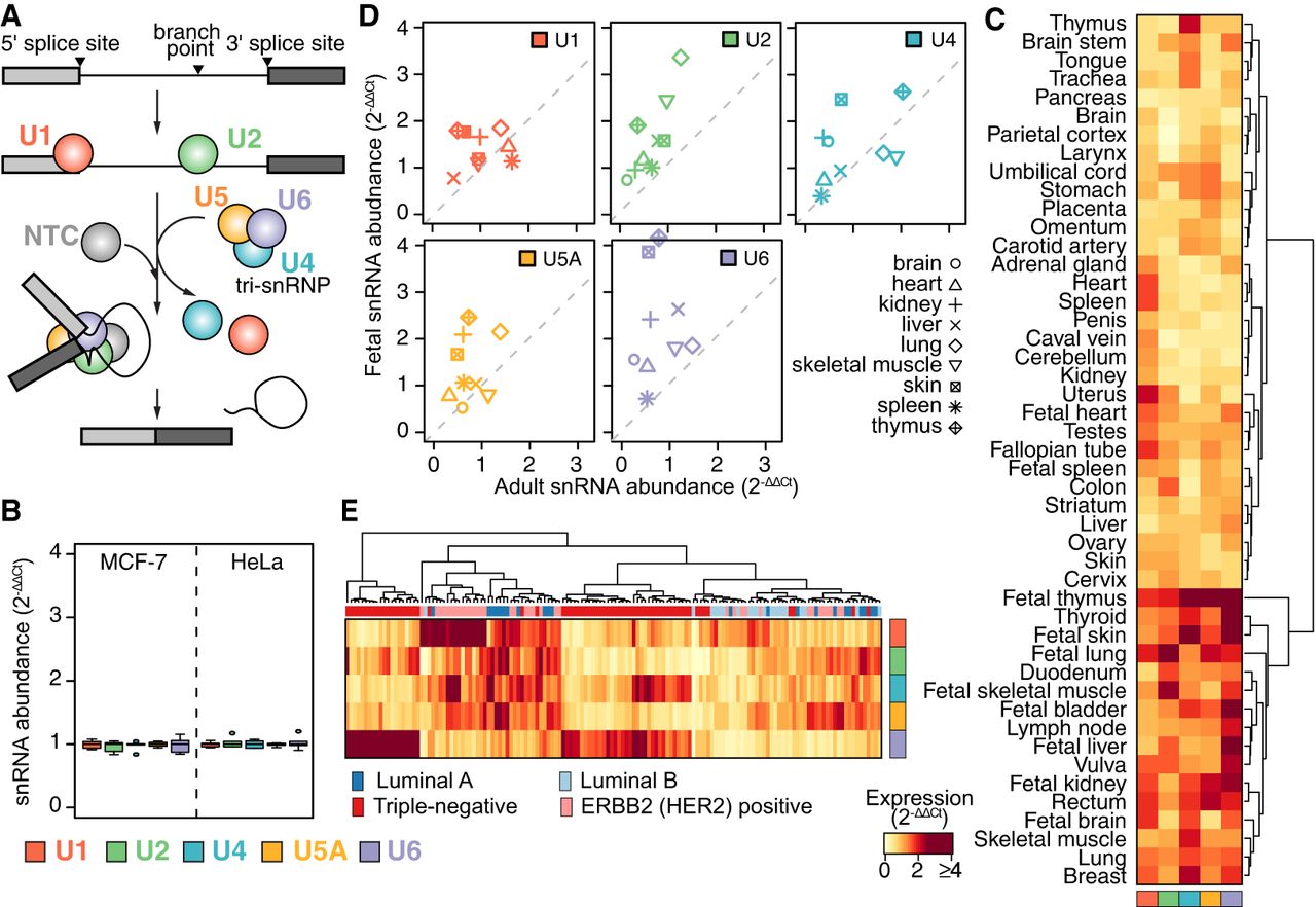 Spliceosomal snRNA abundance is highly variable. (A) Simplified schematic of a single round of splicing, showing individual steps: recognition of the 5′ and 3′ splice sites by the small nuclear ribonucleoprotein complexes (snRNPs) containing the U1 and U2 snRNAs, respectively; recruitment of the U4/U6.U5 tri-snRNP; exit of the U1 and U4 snRNAs and rearrangements of the snRNPs into the conformation required for the active spliceosome; excision of the intron lariat; and ligation of the two adjacent exons. Red indicates U1; green, U2; blue, U4; orange, U5; purple, U6. (B) Reproducibility of ΔCt values from our microfluidic real-time quantitative PCR-based assay to measure snRNA levels across five biological and three technical replicates, using the MCF-7 and HeLa cell lines. For the calculation of ΔCt, the mean of the 7SK RNA, the signal recognition particle RNA (7SL) and 5S rRNA within each tissue was used as a reference. ΔΔCt was calculated relative to the median across individual snRNA within each cell line. (C) Heatmap of relative snRNA abundance across 47 healthy tissues, represented as 2−ΔΔCt. ΔCt values calculated as in B. ΔΔCt values are relative to the median values across all tissues. (D) Expression level (2−ΔΔCt) of snRNAs in adult versus fetal samples from identical tissues. Colors as in A. For comparison with the technical and biological variability (B), scale of the y-axis is kept identical. (E) Variations in snRNA abundance across 144 primary breast cancer specimens, calculated as in C. The column color bar indicates the intrinsic breast cancer subtypes, as defined by immunohistochemistry (IHC) on these samples.