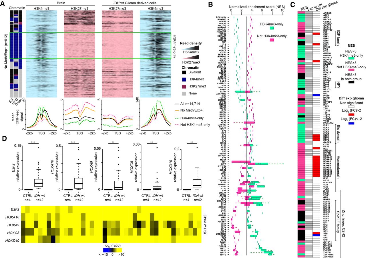 Transcription factor binding motifs in the promoters of genes overexpressed in glioma samples. (A) Data mining–derived ChIP-seq read density data for H3K27me3 (pink) and H3K4me3 (blue) at “No Meth/Exp+” genes in a ±2 kb window centered on their TSS in healthy brain (left) and IDHwt-derived cell lines (right). The mean ChIP-seq signal values are shown on the lower panel for all “No Meth/Exp+” genes (orange line) and for those that are (dotted green line) or not (dotted pink line) marked by H3K4me3-only in ES cells, NPC, and brain. The black line, used as normalized reference, shows the value for all analyzed genes. (B) Transcription factor motif enrichment in the CGI/promoter of “No Meth/Exp+” genes, calculated using i-cis Target and represented as a normalized enrichment score (NES). Enrichment is shown for genes that are (green squares) or are not (pink squares) marked by H3K4me3-only in ES cells, NPC, and brain. When a transcription factor possesses several binding motifs, data are presented as a box plot. (C) Expression status, assessed by RNA-seq, of the transcription factors identified in B. The middle column shows their expression status in healthy control (n = 5) (white, not expressed; gray, expressed: fpkm > 1) and the right column their expression in IDHwt glioma samples (n = 8). The left column shows the motif enrichment in all “No Meth/Exp+” genes (black), and those marked (green) and not marked (pink) by H3K4me3-only in ES cells, NPC, and brain. (D) Expression versus controls of selected overexpressed transcription factor identified in C assessed by RT-qPCR in 42 IDHwt glioma samples. Details for each sample are provided in the lower panel (P-value by Mann–Whitney U test).