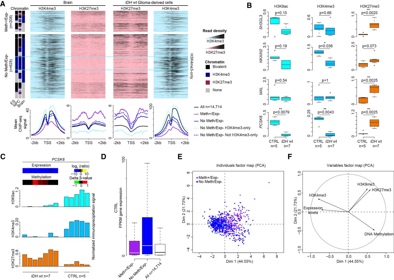 Gene repression is associated with H3K27me3 gain. (A) Data mining–derived ChIP-seq read density data for H3K27me3 (pink) and H3K4me3 (blue) at “Meth+/Exp−” and “No Meth/Exp−” genes in a ±2 kb window centered on their TSS, in healthy brain (left) and IDHwt-derived cell lines (right). The mean ChIP-seq signal values are shown in the lower panels for “Meth+/Exp−” (purple line) and “No Meth/Exp−” (blue line) genes. Genes in the “No Meth/Exp−” group were further subdivided in genes marked (dotted light blue line) and not marked (dotted dark blue line) by H3K4me3-only in ES cells, NPC, and brain. The black line used as normalized reference shows the value for all analyzed genes. (B) ChIP analysis of H3K9ac, H3K4me3, and H3K27me3 at selected genes in IDHwt (n = 7) and control (n = 5) samples. The precipitation level was normalized to that obtained at the TBP promoter (for H3K4me3 and H3K9ac) and at the SP6 promoter (for H3K27me3; P-values calculated with the Mann–Whitney U test). (C) Detail for each sample of the ChIP analysis at the PCSK6 locus. Heatmaps of the expression and methylation values are in the upper panel. (D) Expression level of “Meth+/Exp−” (purple column) and “No Meth/Exp−” (blue column) genes and of all analyzed genes (white column) in healthy controls. (E,F) Principal component analysis. (E) Two-dimensional scatter plot of the values of each “Meth+/Exp−” (purple dots) and “No Meth/Exp−” gene (blue dots) along the first (Dim 1) and second (Dim 2) principal component. For each class defect, the centroids are shown by colored squares. (F) H3K4me3 and expression levels in healthy brain are the variables that most contributed to and were significantly correlated with the first principal component.