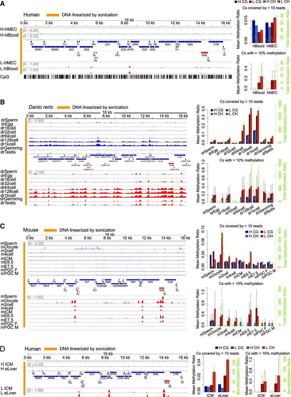 Strand-specific mapping of mtDNA methylation. (A, left) BS-seq (WGBS) methylation profiles of linearized mtDNA in human B cells (GSM922328 under GSE37578) and mammary epithelial cells (MEC; GSM721195 under GSE29127). The annotations between the H and L strand methylation maps show positions of mtDNA elements: In blue are polypeptide genes, rRNAs and tRNAs coded on the H strand and using L strand as template; in red are polypeptide genes, rRNAs and tRNAs coded on the L strand and using H strand as template. (Right) Mean (left y-axis) and total (right y-axis) mtDNA methylation of CG and CHs on H and L strand, respectively. The mean methylation level is the average methylation level of C sites covered by >10 reads. The total methylation level is the sum of methylation level of C sites covered by >10 reads. We only considered C sites covered by at least 10 reads, with all such C sites (top) or part of them with >10% methylation (bottom) summarized and the stringent cutoff (10%) is used to avoid arguments that some lowly methylated Cs are attributable to background noise. Error bars represent SEM. (B, left) BS-seq (WGBS) methylation profiles of linearized mtDNA in zebrafish sperm, oocyte (eggs), cleavage-stage embryos at the 16-cell, 32-cell, and 64-cell stages, early-blastula 128-cell stage, midblastula stage (MBT) 1000-cell stage (1kcell), the gastrula stage at the germ ring (Germring), and testis from an inbred TU strain (Testis) during early embryogenesis (GSE44075) on the H and L strand. Blue tracks show methylation levels of the H strand (scale from 0 to 0.5), and red tracks show L-strand methylation (scale from 0 to 1.0). Annotations are as in A. (C, left) BS-seq (WGBS) methylation profiles of linearized mtDNA in mouse sperm, oocyte, and early stage embryos including two-cell and four-cell cleavage stages, early ICM, E6.5 embryos, E7.5 embryos, and the primordial germ cells (PGCs) from E13.5 male and female embryos (GSE56697) on the H and L strands, respectively. Blue tracks show methylation levels of the H strand (scale from 0 to 0.25), and red tracks show L-strand methylation (scale from 0 to 1.00). Annotations are as in A. (D, left) BS-seq (WGBS) methylation profiles of linearized mtDNA in mouse late blastocyst (inner cell mass [ICM]) and human post-implantation embryonic liver (eLiver) (GSE49828) on the H and L strands. Blue tracks show methylation levels of the H strand (scale from 0 to 0.25), and red tracks show L-strand methylation (scale from 0 to 1.00). Annotations are as in A.