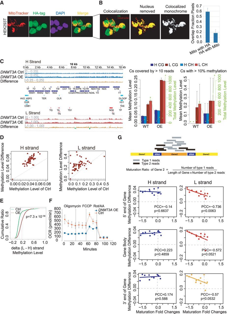 Presence of DNMT3A in mitochondria and effects of DNMT3A overexpression on mtDNA methylation and transcript processing. (A) Immunofluorescence staining of HA-tagged DNMT3A. Cells were exposed to MitoTracker Orange (red) to label mitochondria and anti-HA with DNMT3A-transfected cells (green) and DAPI (blue) to label nuclei. Yellow pixels in the Z-stack composite indicate sections in which DNMT3A colocalized with mitochondria, showing that DNMT3A localized to both nucleus and mitochondria. (B) Overlap of mitochondria fluorescence with DNMT3A-HA-tagged fluorescence among pixels passing a stringent background threshold to remove correlation contributed by background signal. (C, left) mtDNA methylation profiles after DNMT3A overexpression (DNMT3A OE) on the H and L strands. Blue tracks show methylation levels of the H strand (scale from 0 to 0.25) or L strand (scale from 0 to 1), and red (positive) or green (negative) tracks show methylation difference. Annotations and summary statistics are as in Figure 1. (Right) Mean (left y-axis) and total (right y-axis) mtDNA methylation of CG and CHs on the H and L strands, respectively. (D) Scatter plot between the mean methylation level of 63 functional elements of control samples (x-axis) and corresponding DNMT3A OE samples (y-axis, DNMT3A OE) on the H and L strands. (E) Cumulative curve of methylation level difference between L and H strands after sampling 1000 paired Cs under DNMT3A OE. The P-value for the difference between DNMT3A OE and control was calculated with a one-sided t-test. (F) Oxygen consumption of DNMT3A OE with control A549 cells. (G, upper) Graphic illustration of maturation ratio calculation. (Lower) Scatter plot of maturation fold changes (FC) against H- and L-strand methylation difference of 5′ end (±200 bp of TSS), gene body, and 3′ end (±200 bp of TTS) of gene comparing DNMT3A OE with control. (*) Negative PCC with P < 0.01.