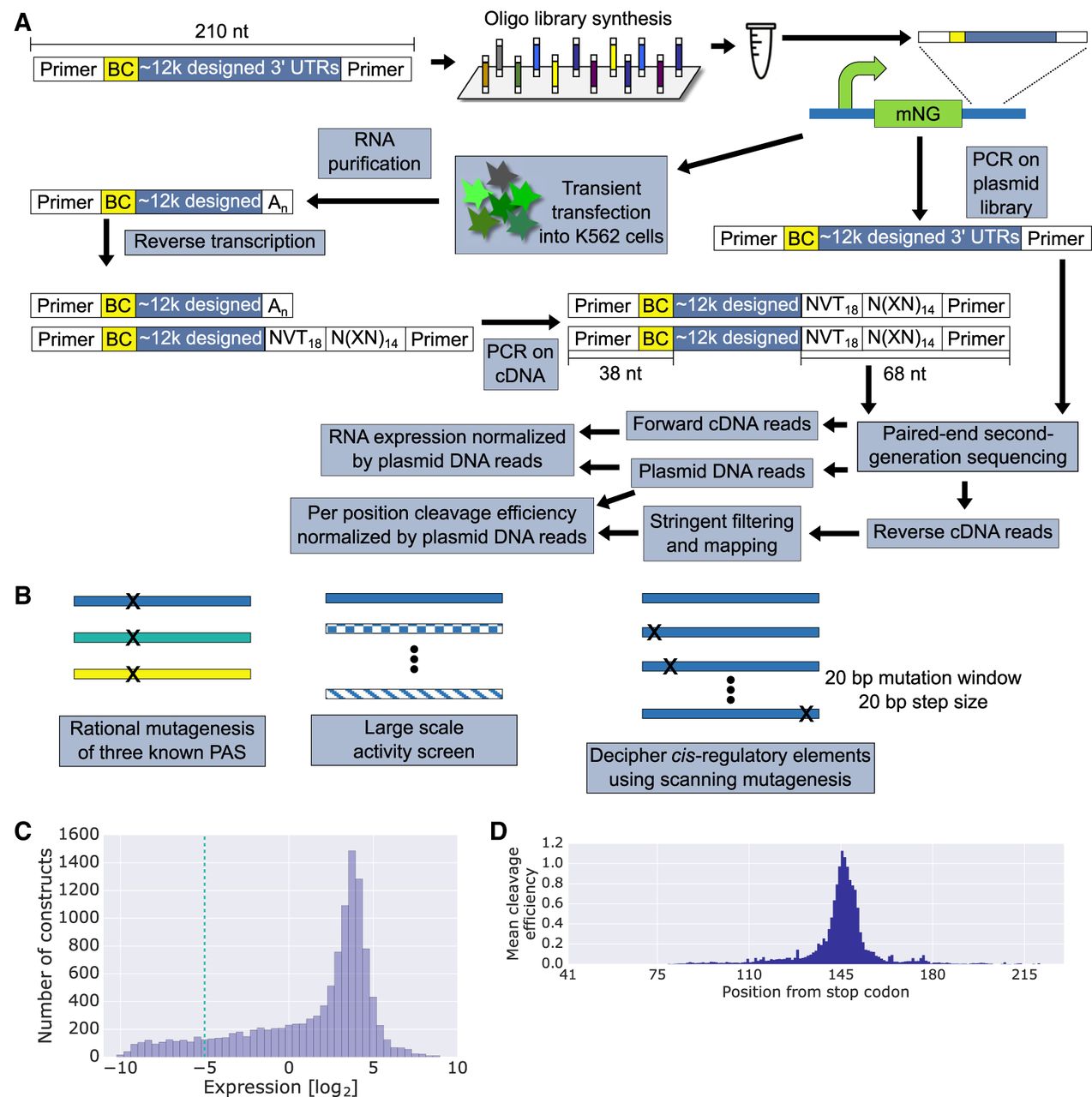 A high-throughput system for studying PAS-mediated regulation of gene expression. (A) A schematic representation of a massively parallel reporter assay measuring expression and cleavage efficiency of PAS reporters (Methods). Briefly, sequences are designed in silico, synthesized, and cloned into a reporter plasmid containing mNeonGreen. The plasmid is transiently transfected into K562 cells, from which RNA is extracted and reverse-transcribed with a poly(T) primer. N = any base synthesized randomly, V = any base except T synthesized randomly, X = A, C, G or T preselected as described in the Methods. The cDNA and plasmid DNA are amplified for paired-end second-generation sequencing. The barcodes of each library member are quantified in the forward cDNA reads and the plasmid DNA reads. These are used to calculate normalized expression. The reverse cDNA reads are mapped to their respective library members identified by the barcode in the forward DNA reads. Following stringent filtering, the cleavage efficiency distribution, normalized by the plasmid DNA reads, is calculated. (B) Library design is based on the three illustrated schemes. First, we mutated three known PASs by varying annotated regulatory elements and surrounding sequences. Second, we constructed a compendium of 6197 native PASs from annotated transcripts of viruses whose host is human and from K562 3′ end sequencing data. Finally, we applied scanning mutagenesis by mutating every 20-bp sequence in selected 629 native PASs (Methods). (C) A histogram depicting the distribution of RNA expression levels acquired by the methods in A. The −5 cutoff is used later to define positive and negative sets for motif analysis. (D) Per position mean cleavage efficiency calculated over all library variants. Positions are indicated as the distance from the mNeonGreen stop codon.