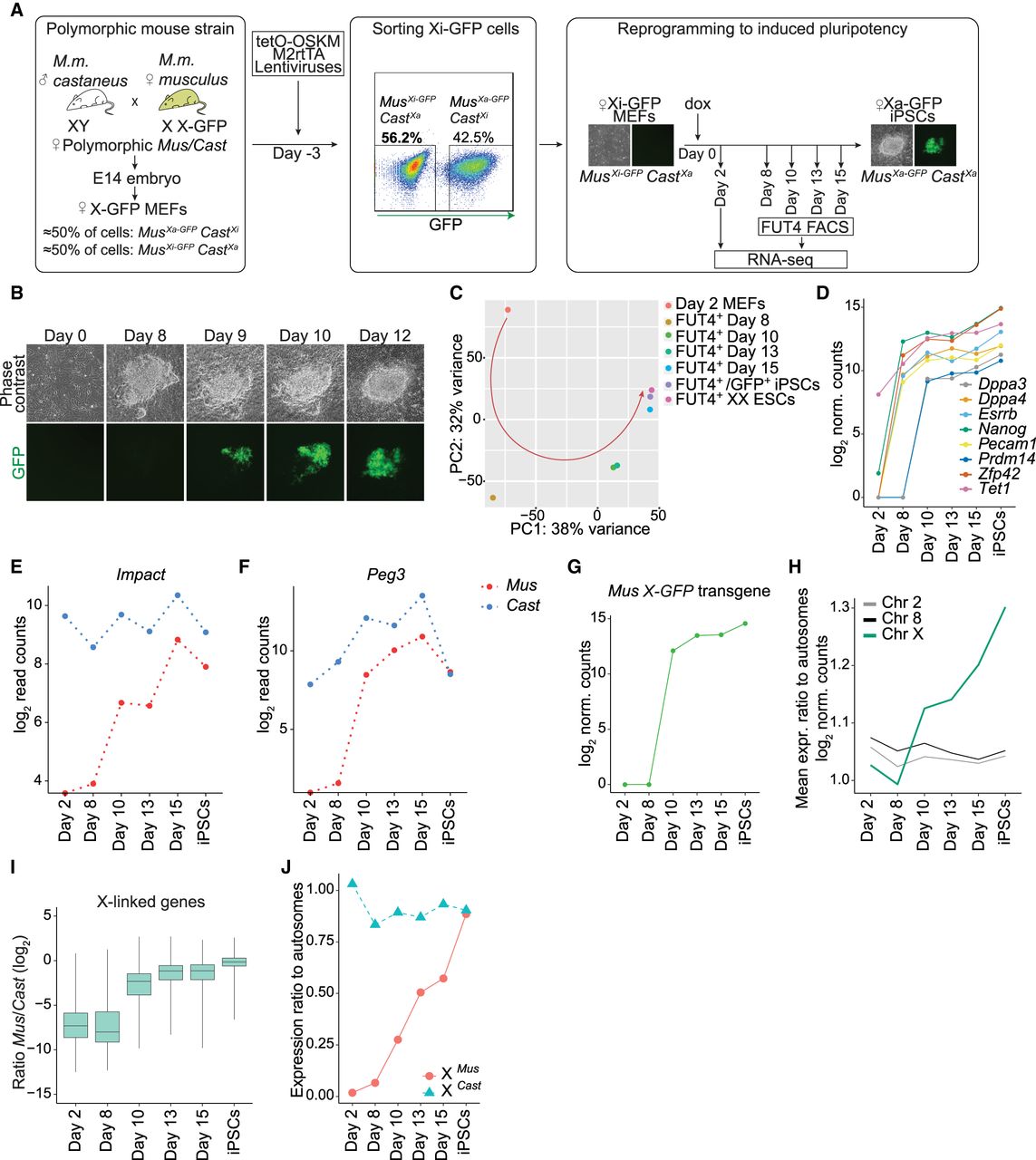 Allele-resolution system to study transcriptional reactivation of X-linked genes during reprogramming to pluripotency. (A) Schematic representation of the system used to trace XCR during reprogramming. (M2rtTA) Reverse tetracycline transactivator. (B) Phase contrast and fluorescent images of representative stages of reprogramming from day 0 to day 12, starting from female MusXi-GFP/CastXa MEFs to MusXa-GFP/CastXa iPSCs. GFP+ cells are increasing in number as a result of XCR. (C) Principal component analysis (PCA) of gene expression from different stages of reprogramming. Each colored dot represents a different time point: day 2 (orange), 8 (dark yellow), 10 (green), 13 (turquoise), 15 (blue), FUT4+/GFP+ iPSCs after four passages (purple), and female ESCs (pink). (D) Levels of pluripotency network gene expression (log2-transformed normalized read counts) during the time course of reprogramming. (E) Expression levels of Impact, an autosomal, paternally imprinted gene during factor-induced reprogramming. (F) As in E for Peg3. (G) X-GFP transgene expression during reprogramming (log2-transformed normalized read counts). (H) Mean expression ratio of Chromosome 2, 8, and X relative to autosomes (log2 normalized counts) during reprogramming. (I) X-linked genes expression ratio Mus/Cast (log2-transformed normalized read counts). See Methods. (J) Mean expression ratio of the MusXi allele (red) and CastXa allele to autosomes during reprogramming.