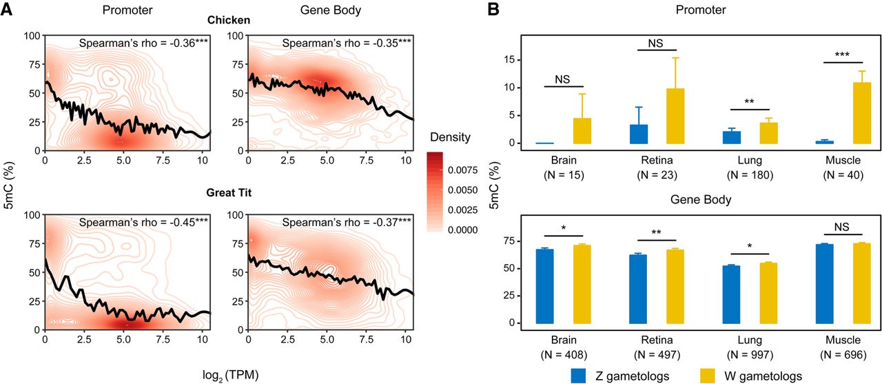 DNA methylation and transcription in avian genomes. (A) Density of data points as a function of CpG methylation (5mC [%]) and gene expression (log2 [TPM]) in female chickens and a male great tit (for male chickens, see Supplemental Fig. S1). The relationship between methylation and gene expression was smoothed with cubic splines (black lines). Number of genes with CpG methylation data: chicken: N = 11,662 for promoters and N = 11,723 for gene bodies; great tit: N = 14,694 for promoters and N = 14,721 for gene bodies. (B) Comparison of DNA methylation between aligned CpGs of Z and W gametologs. N depicts the number of Z-W-aligned CpGs with at least three mapped reads in each sample. Statistical significance was evaluated using paired Mann–Whitney U tests. For A and B, the promoter of a gene was defined as upstream 1.5 kb to downstream 500 bp of its transcription start site. (***) P < 0.001, (**) P < 0.01, (*) P < 0.05, (NS) not significant.