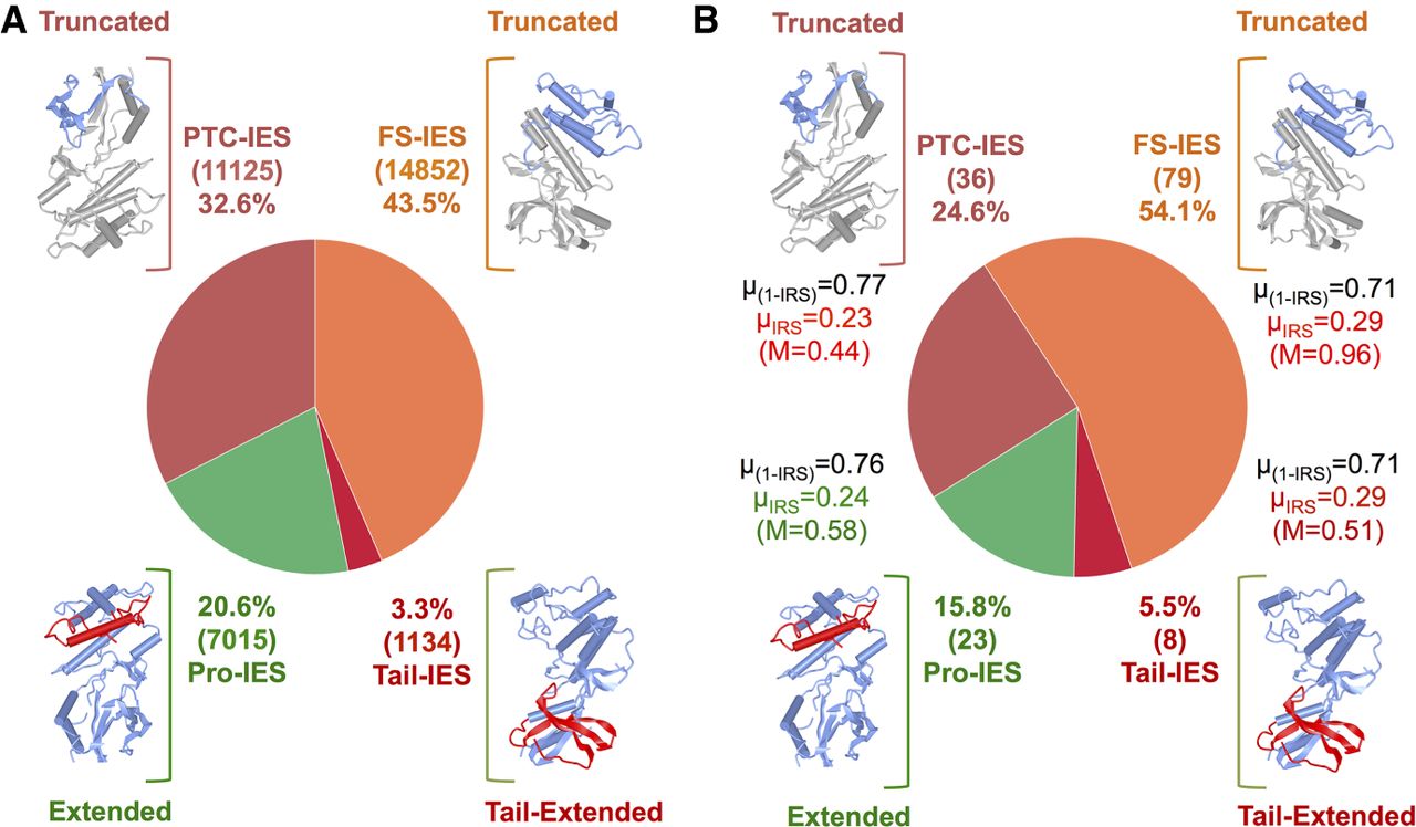 IES insertion within the coding sequence (CDS) potentially diversifies protein sequences. (A) Theoretical diversification potential of PGM-IESs. Pro-IES (green): fraction of 3n, non-PTC-inducing IESs (“productive” IESs). Tail-IES (crimson red): fraction of IESs that do not introduce a premature termination codon (PTC) but lead to the ablation of the true stop codon. FS-IES (orange): fraction of IESs that disrupt the open reading frame by introducing a downstream PTC owing to frameshift (FS). PTC-IES (red): fraction of IESs that introduces a PTC within the insertion. (B) Classification of the 146 within-CDS IES insertions observed at 32°C based on the predicted transcriptional outcome. The mean excision score (1-µIRS), mean IRS (µIRS), and maximum IRS (M) are indicated beside each category. The number of IESs is indicated within parentheses. The predicted effect on the protein products is depicted schematically next to each class.
