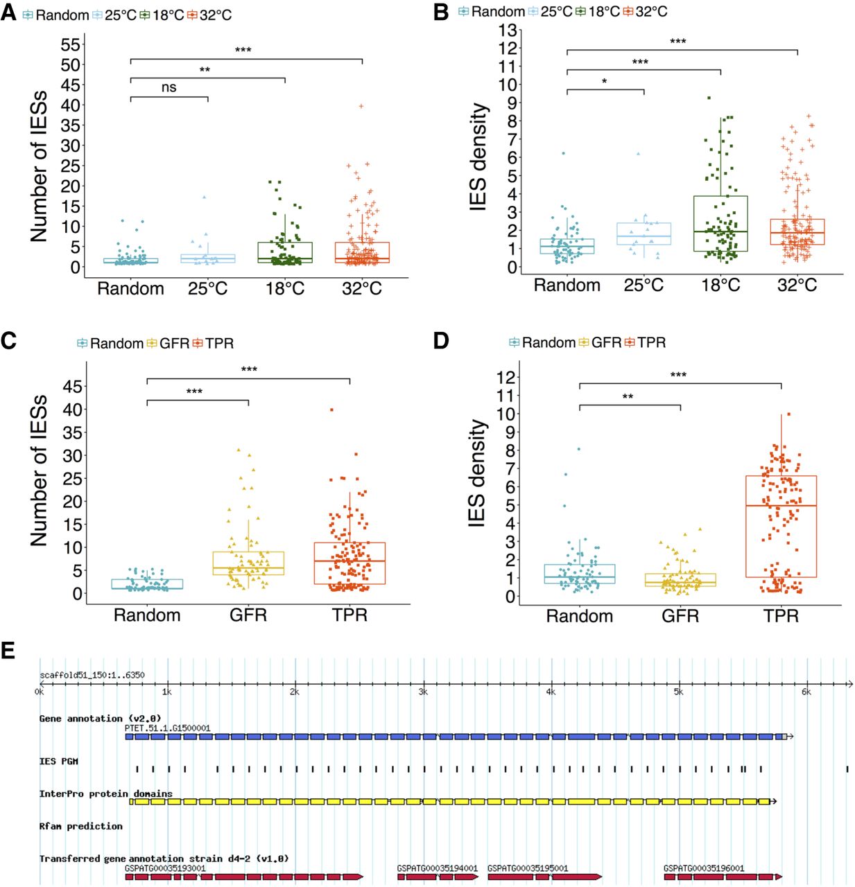 TPR-motif and GFR Cys-rich domain-containing proteins are IES-rich gene families susceptible to inefficient IES excision in response to temperature changes during autogamy. (A) Genes affected by IES retention at 18°C and 32°C have a significantly greater than average number of IESs. (B) Across all the investigated temperatures, genes hit by significant IES retention are IES dense. (C) TPR and GFR proteins show extraordinary per-gene IES counts. (D) TPR but not GFR proteins are characterized by elevated IES density (Wilcoxon rank-sum test: [ns] P > 0.05; [*] P < 0.05; [**] P < 0.01; [***] P < 0.001). (E) A TPR-motif gene (PTET.51.1.G1500001) showing a characteristic pattern of IES distribution. This gene is hit by multiple IES retention at 32°C. IESs are positioned almost invariably at the 5′ end of the TPR coding exons. According to the v2.0 annotation of macronuclear gene models, PTET.51.1.G1500001 is the gene with the greatest number of IESs to be found in the P. tetraurelia genome. (TPR) Tetratricopeptide repeat region motif (IPR019734); (GFR-Cys-rich) growth factor receptor cysteine-rich domain (IPR009030); (IES density) number of IESs per kb.